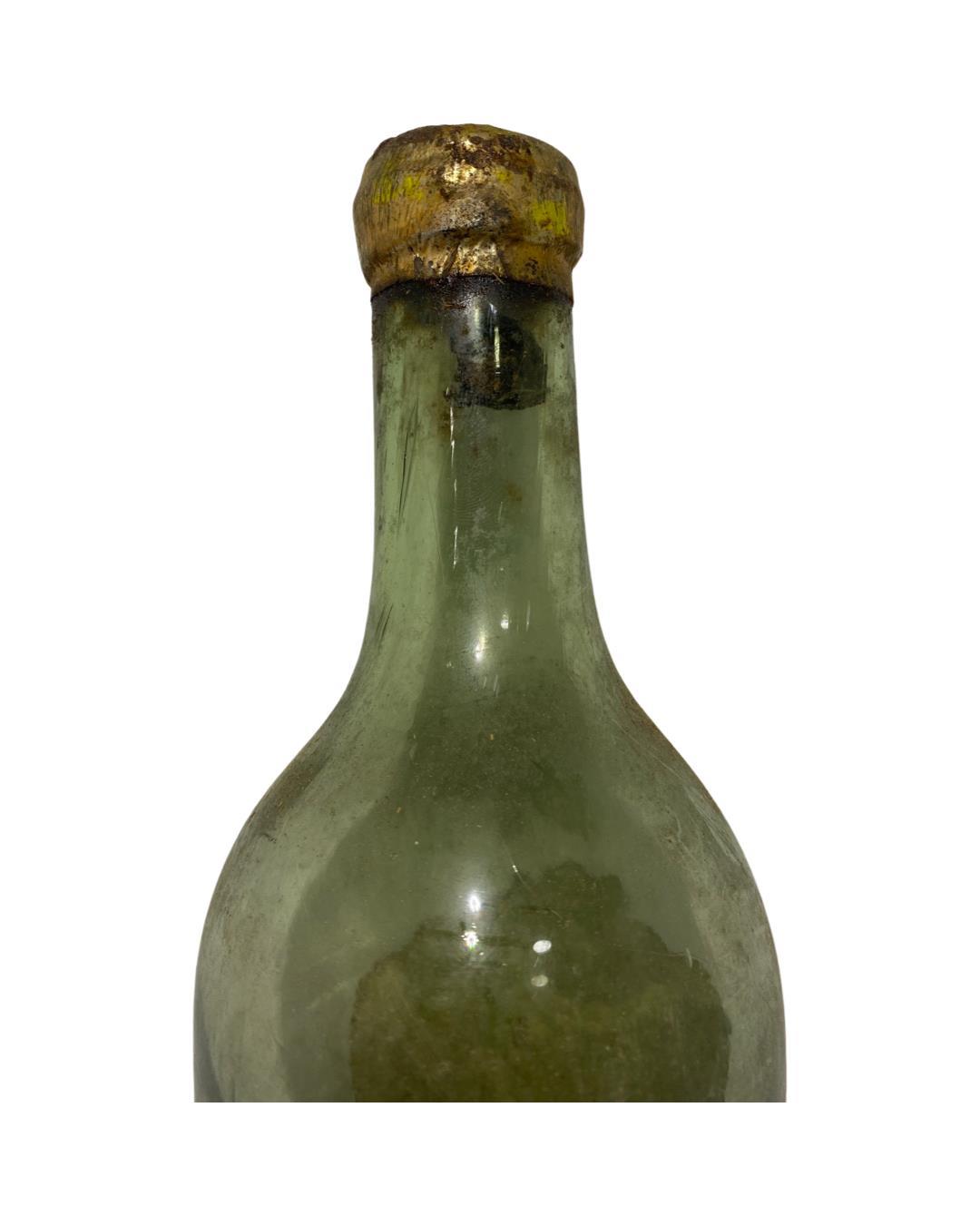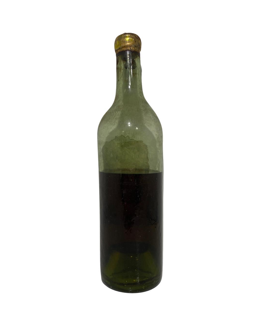 Certainly one of the older and more rare bottles we have seen come through the auction. This Vieux Cognac has seen better days with some poor ullage bu the seal is still intact. The cork appears to have withered away. The label is better on this bottle with a lady in a red top with a harp.