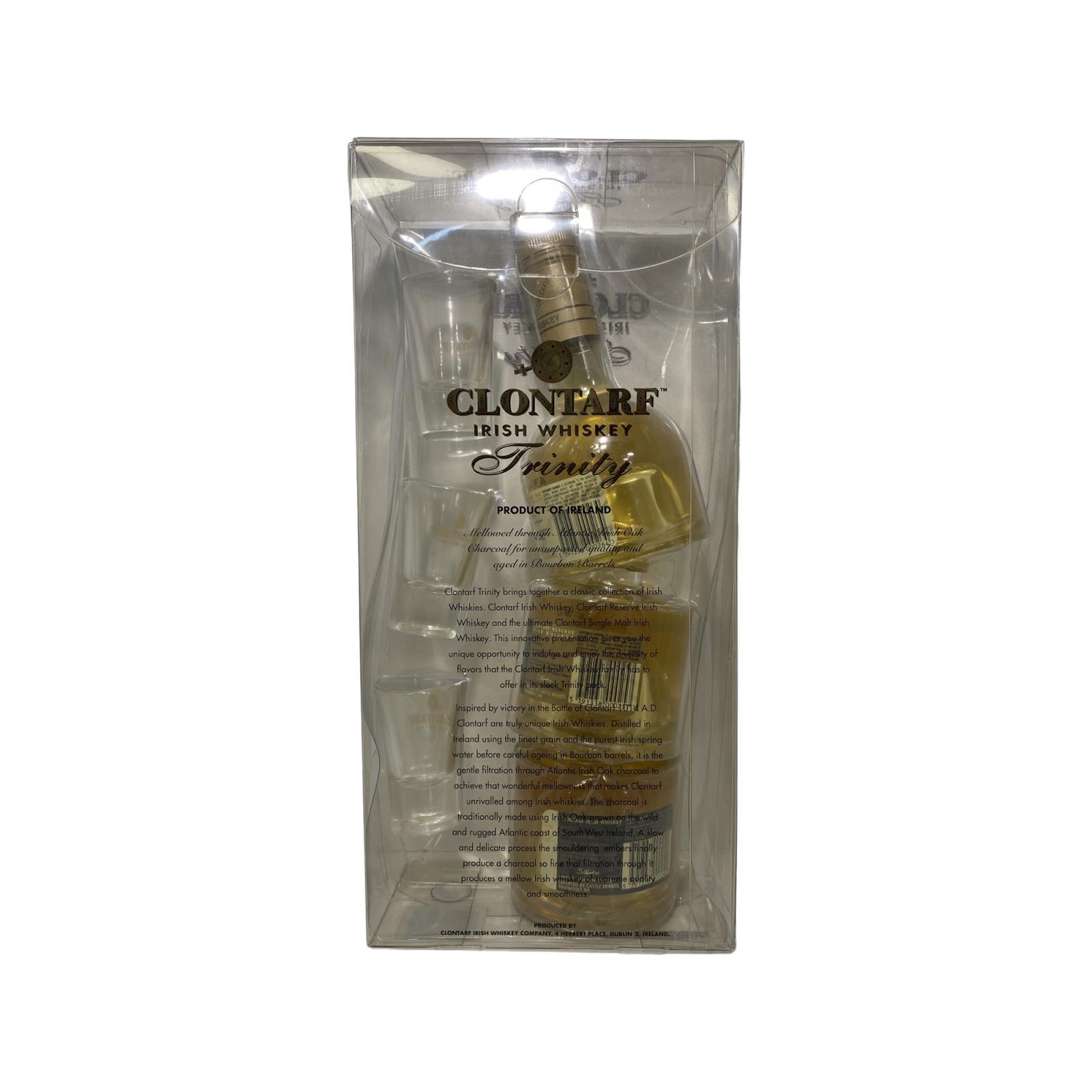 A swirly pack containing three stackable 20cl bottles of delicious Irish Whiskey. One each of Clontarf Black Label, Clontarf Reserve and Clontarf Single Malt.