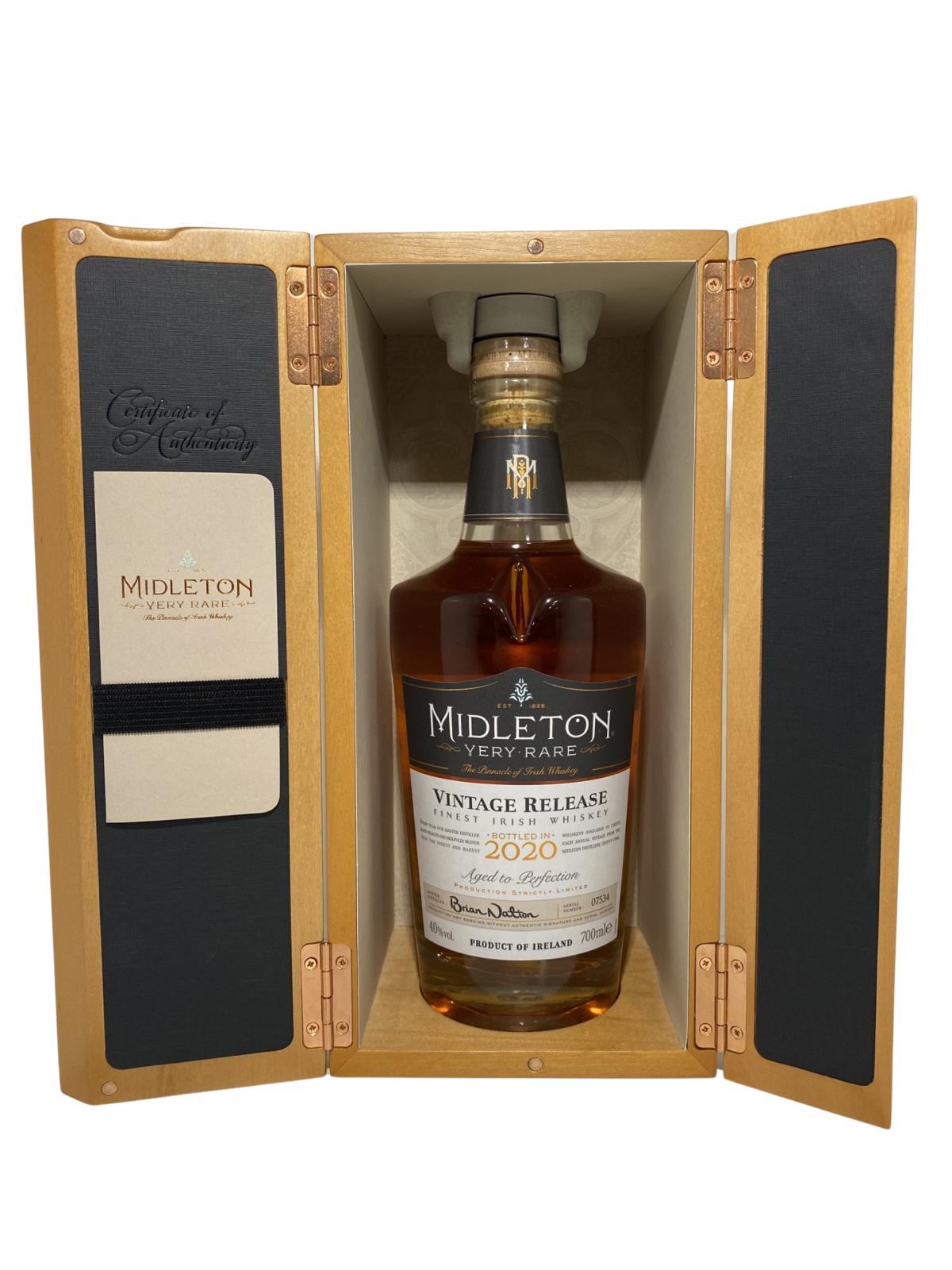 The 2020 edition to Ireland's most premium and beloved whiskey series; Midleton Very Rare. This is the 38th installment and the last release under Brian Nation appointed Master Distiller of the Midleton Distillery in 2014. Both the bottle and gift box are in very good condition, certificate and distillery invite are also included.Bottle number 7534