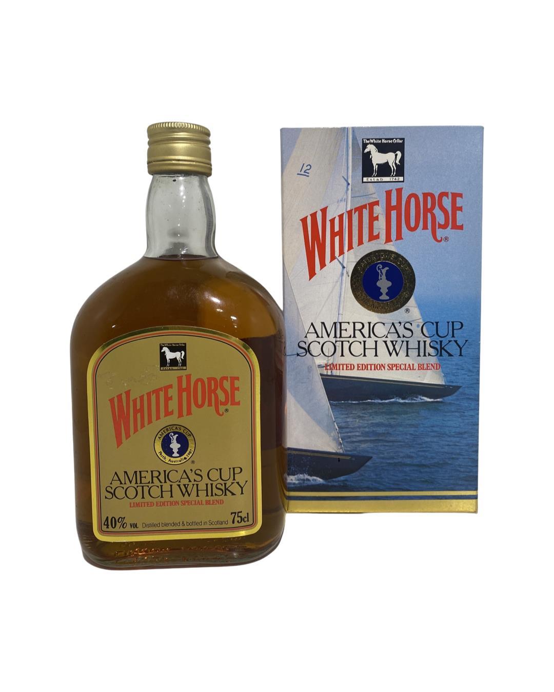 Released to commemorate the America's Cup of 1987. A limited-edition bottling of White Horse blended Scotch whisky.First produced back in 1861 and is known for its use of certain single malts in the blend, namely Lagavulin, Talisker, and Caol Ila. For keen eyed buyers you may have seen the Lagavulin 16 with white horse distillers on the label in the past.