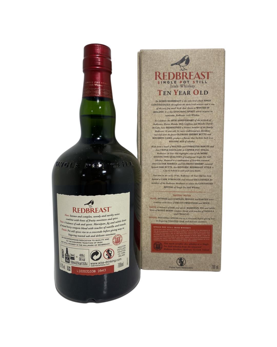 Launched to celebrate the 30th anniversary of the revival of the Redbreast brand, Redbreast 10 was resurrected. Made from a mash of malted and unmalted barley and then triple distilled in copper pot stills, Redbreast 10-Year-Old highlights some of the more distinctive qualities of traditional Single Pot Still whiskey. Matured in a combination of bourbon seasoned American oak barrels and oloroso sherry-seasoned Spanish oak butts, this historic redbreast style is a joy to behold in each and every bottle. Both the bottle and gift box are in very good condition.