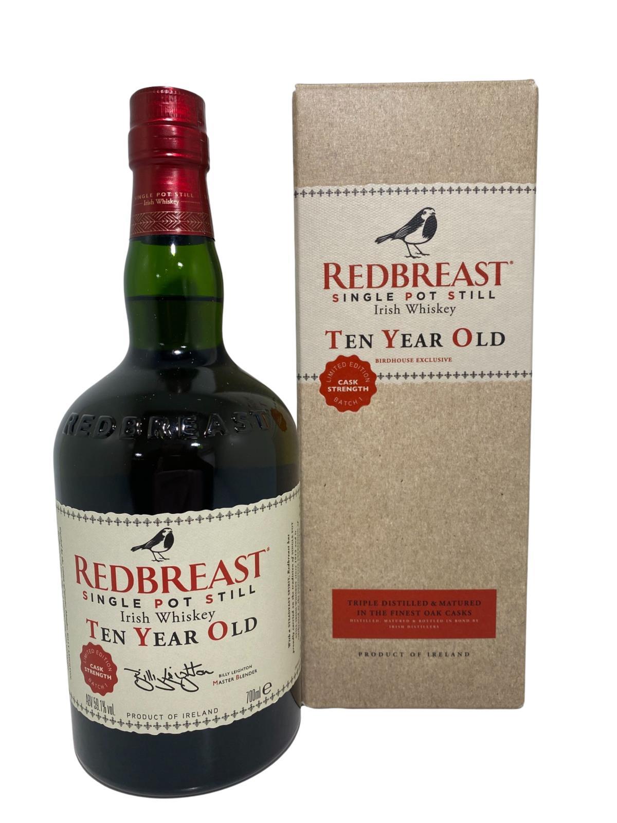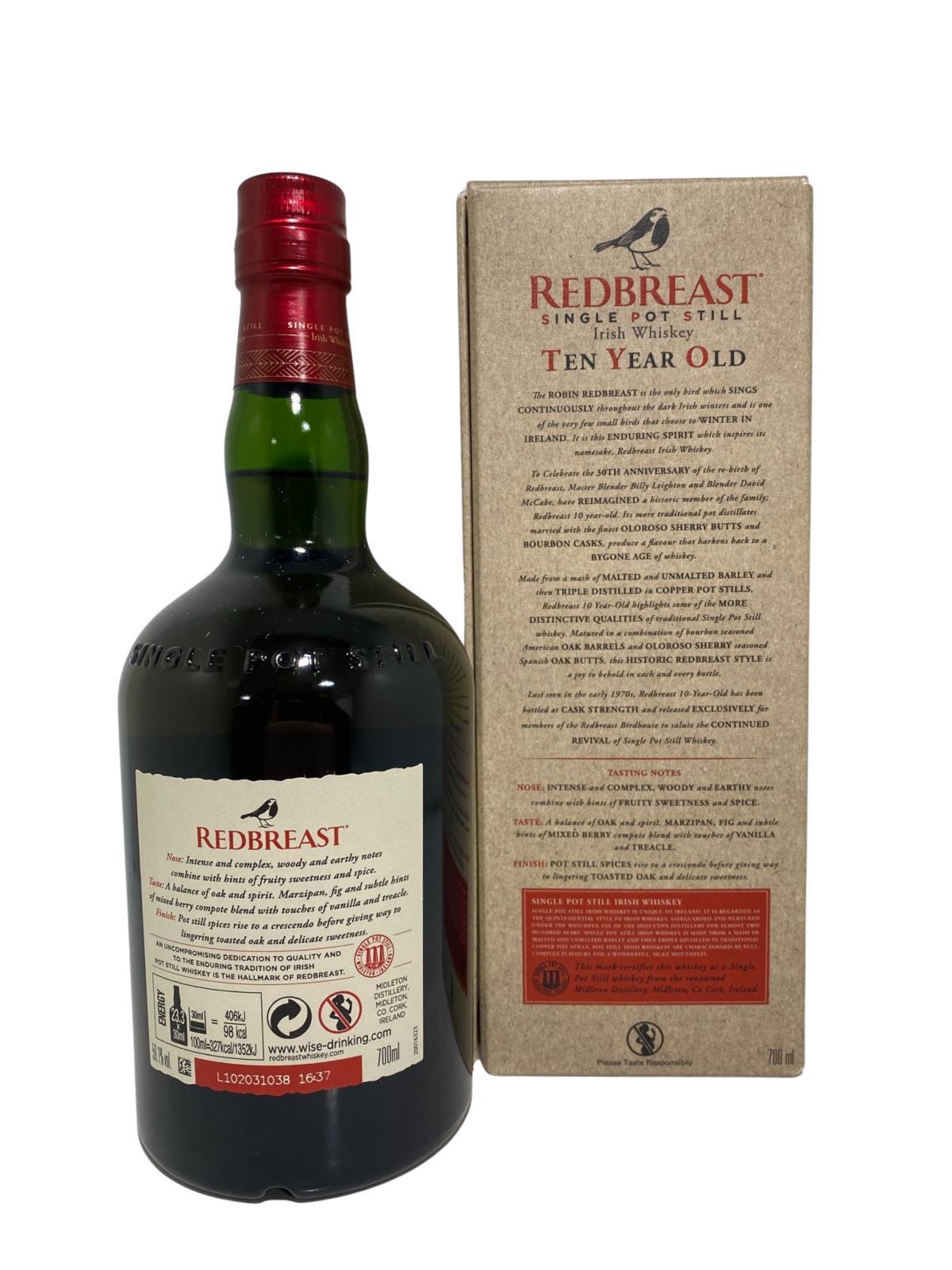 Launched to celebrate the 30th anniversary of the revival of the Redbreast brand, Redbreast 10 was resurrected. Made from a mash of malted and unmalted barley and then triple distilled in copper pot stills, Redbreast 10-Year-Old highlights some of the more distinctive qualities of traditional Single Pot Still whiskey. Matured in a combination of bourbon seasoned American oak barrels and oloroso sherry-seasoned Spanish oak butts, this historic redbreast style is a joy to behold in each and every bottle. Both the bottle and gift box are in very good condition.