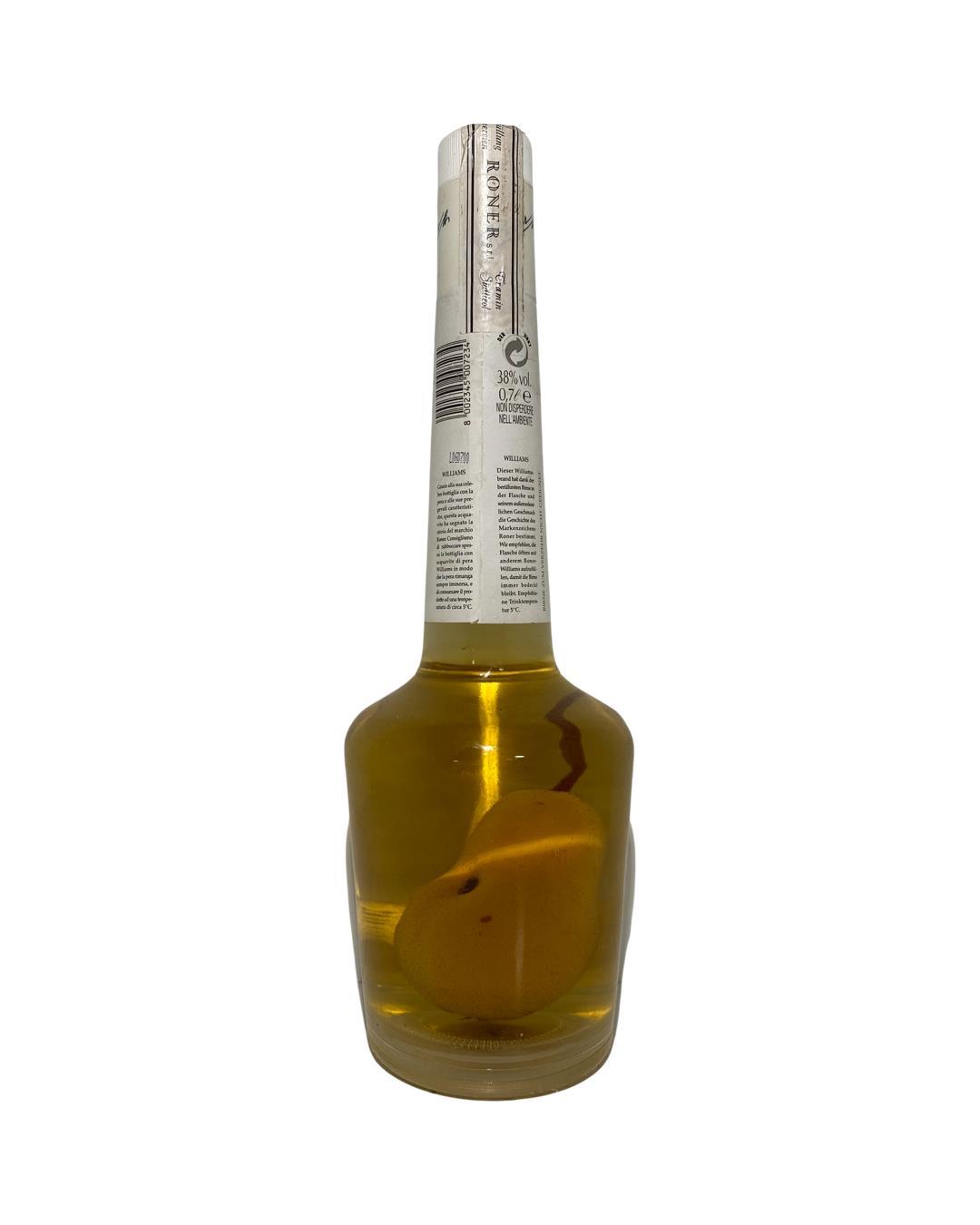 Roner Williams-Christ pear brandy is traditionally distilled in South Tyrol by the most awarded distillery in Italy. This bottle has a whole pear in it.