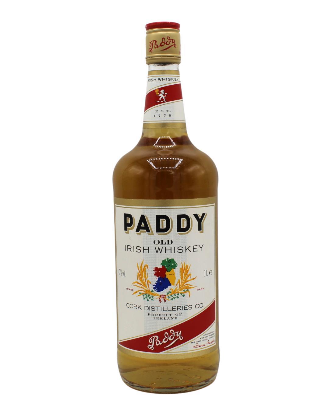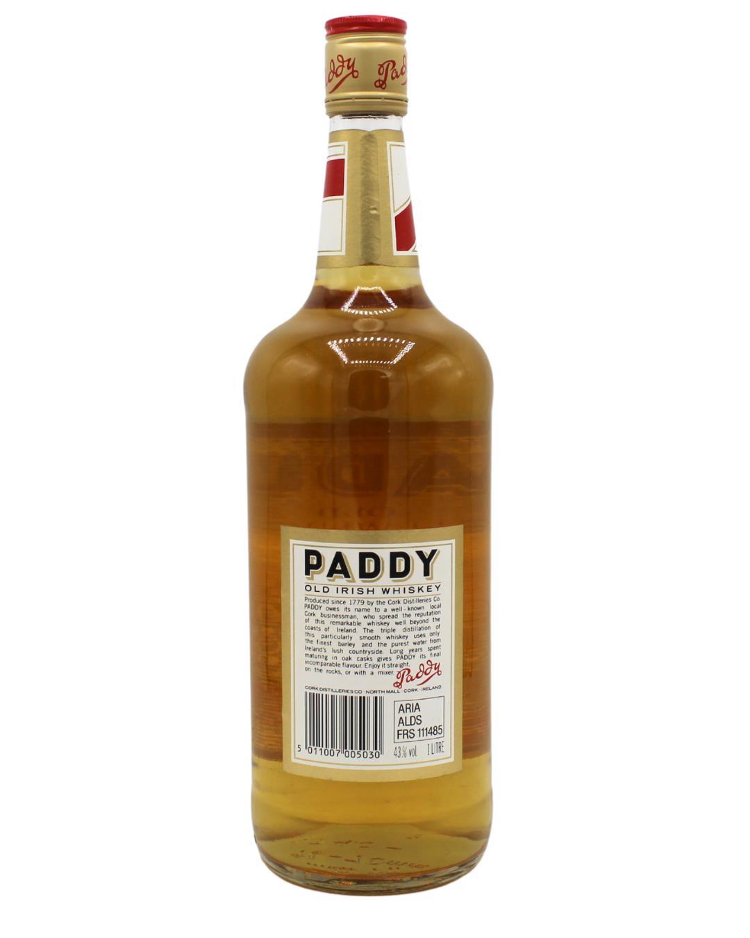 A litre bottling of Paddy Irish Whiskey. A blend of triple distilled pot still, malt and grain whiskeys and matured for many years in oak casks, paddy is a soft and mellow whiskey with a sweet, malty finish.