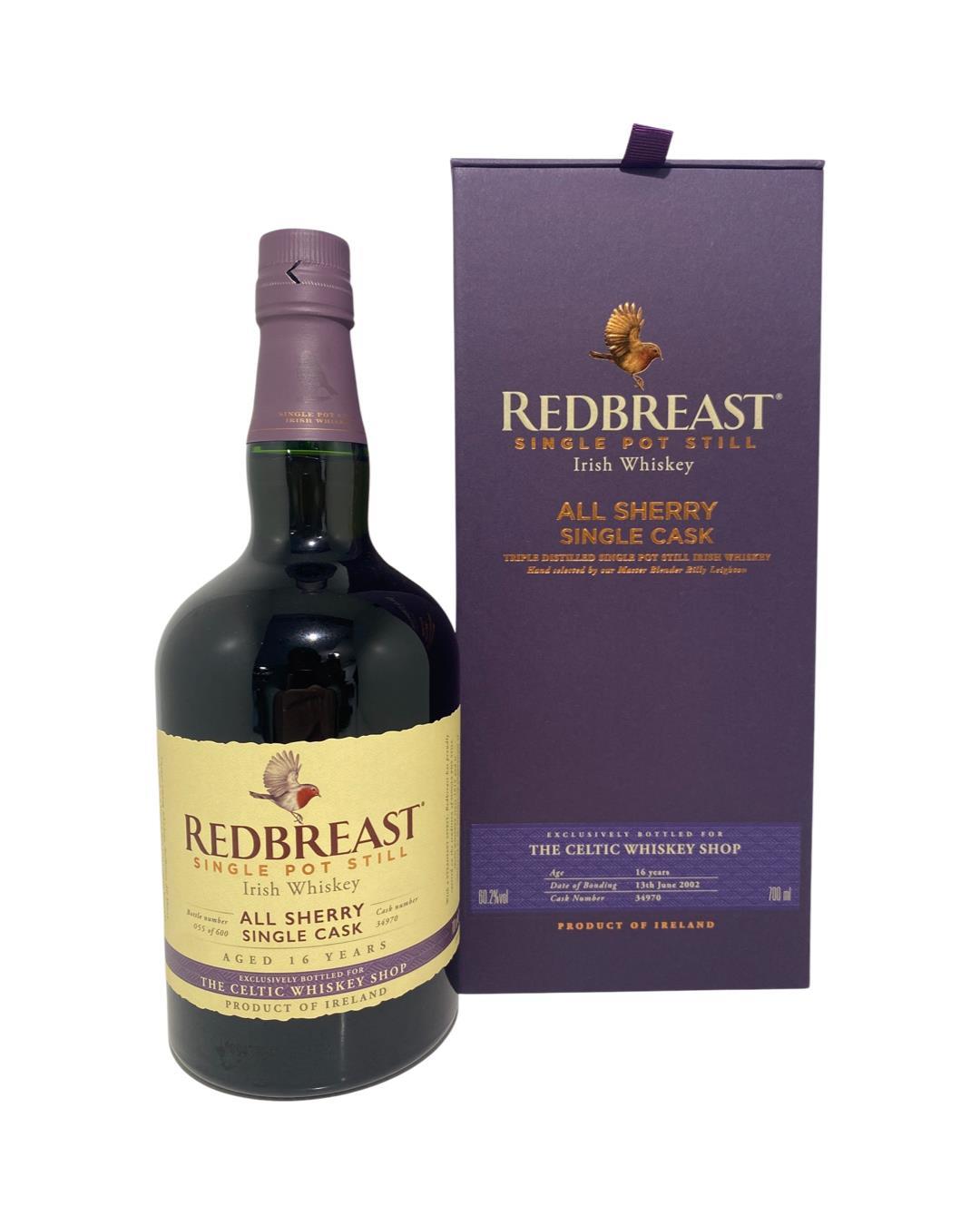 A limited edition Single Cask from Redbreast whiskey, hand selected and bottled exclusively for the Celtic Whiskey Shop. This single pot still is tripled distilled and entirely matured for 16 years in Oloroso Sherry Casks. Bottled at 60.2%, single cask 34970 is limited to just 600 bottles.
