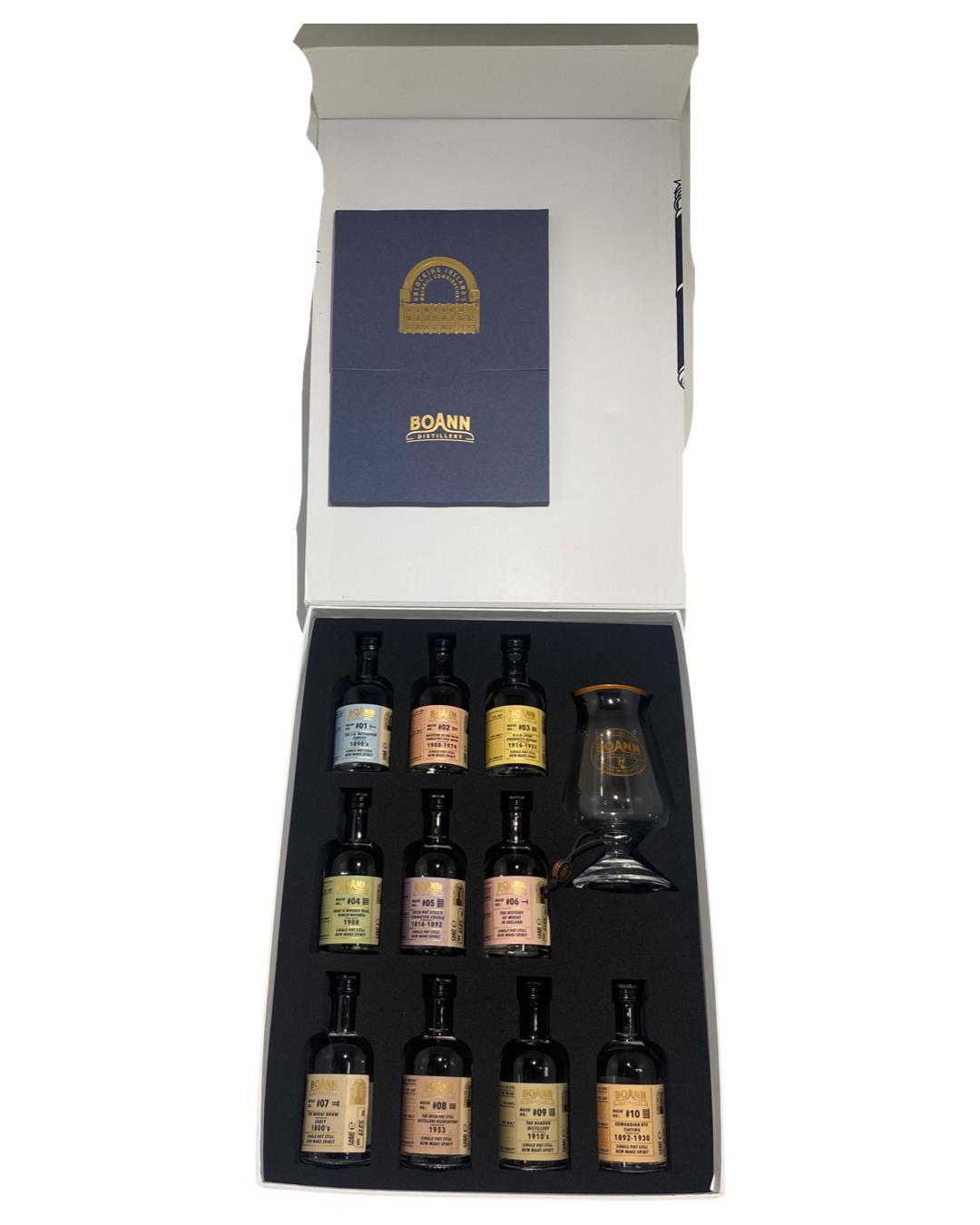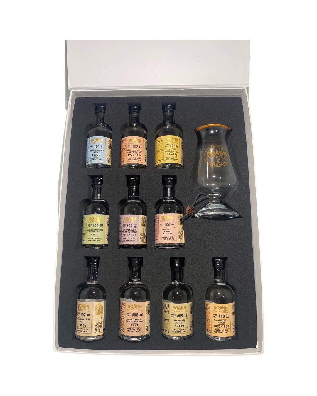 Boann Distillery is thrilled to introduce the Vintage Mashbills Tasting Pack, which is comprised of ten different single pot still new make samples, produced from the mashbills of old distilleries, now lost to the annals of time.Each Vintage Mashbill Tasting Pack contains 10 x 50ml bottles, each containing a different new make single pot still distillate. Every bottle is accompanied with a full historic background of the era in which this mashbill was in use, as well as the grains comprised in that mashbill.