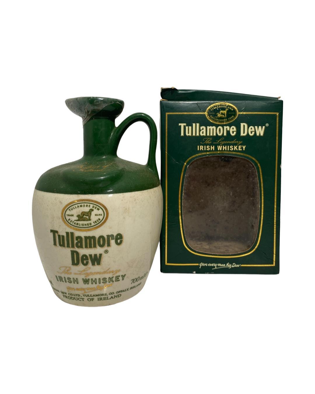 Tullamore Dew is a smooth, mellow whiskey that is a blend of Pot Still and Grain Whiskeys which are presently distilled in Midleton Distillery in County Cork. This is in an older crock bottling. The inside of the box has seen better days and is damaged as can be seen in the photos.