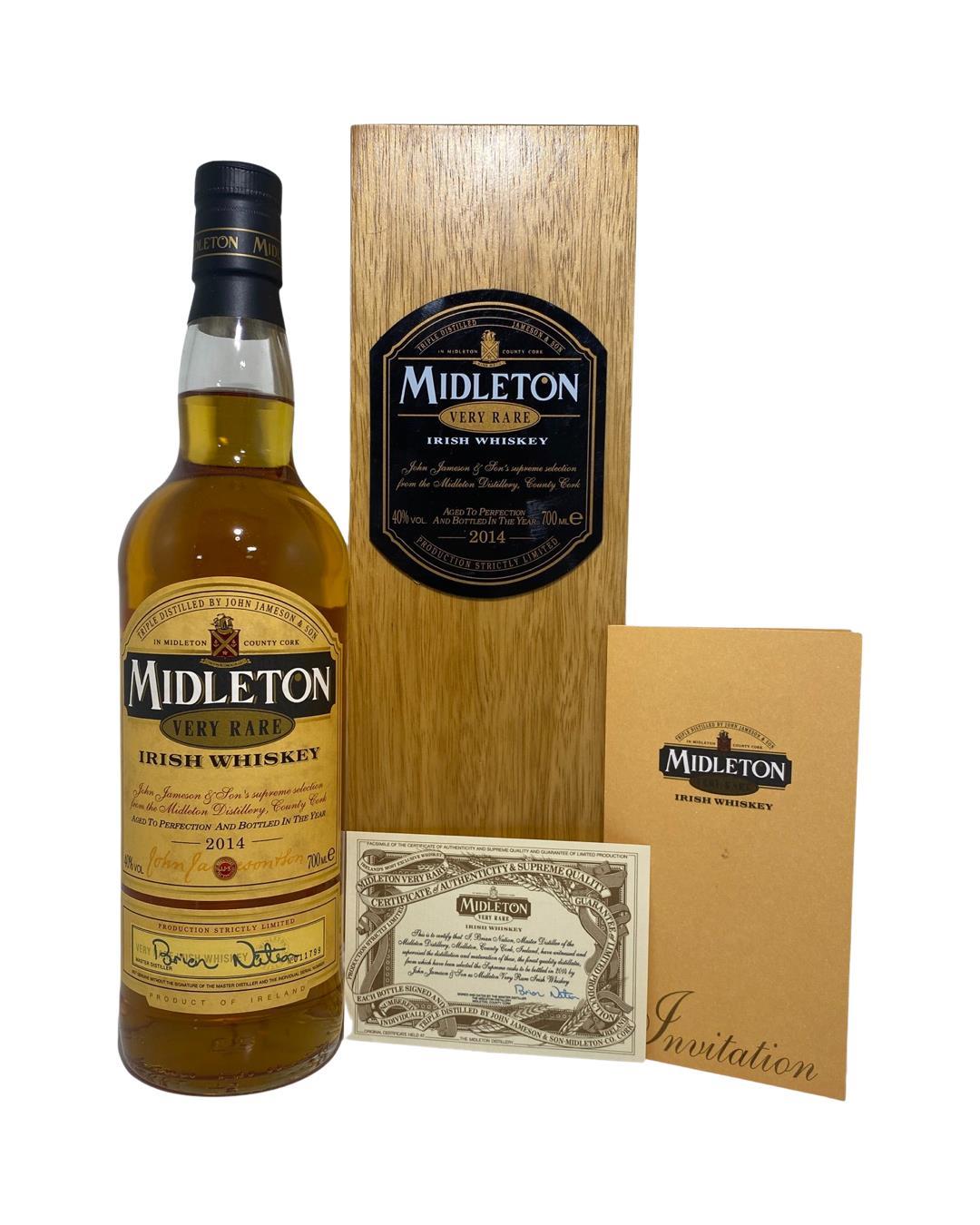 The Midleton Very Rare 2014, is a bottling brought out by the Midleton Distillery in Co. Cork. The ‘Midleton Very Rare’ range was launched in 1984 and a new vintage has been released every year since then. Barry Crockett started off the ‘Midleton Very Rare’ range while he was the Master Distiller of Midleton Distillery, in 2013 Barry Crockett retired from his role of Master Distiller. From 2014 onwards Brian Nation has been creating the ‘Midleton Very Rare’ range, maintaining its role as standard-bearer and pinnacle of Irish Whiskey. The bottle and gift box in great condition also include the cert and distillery invite.