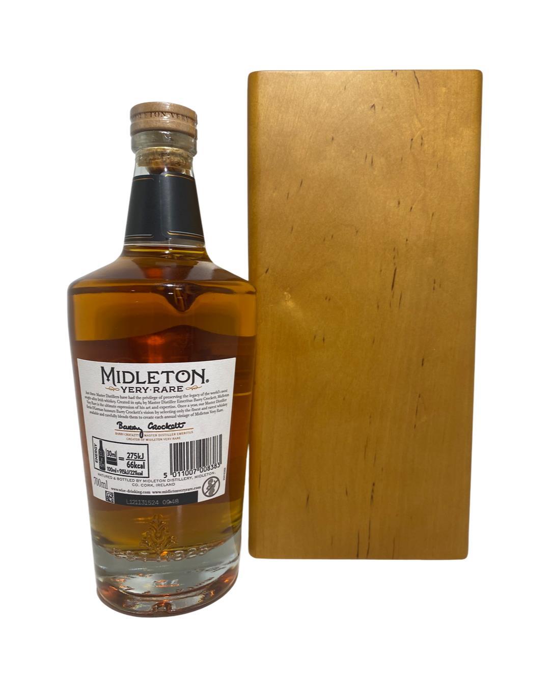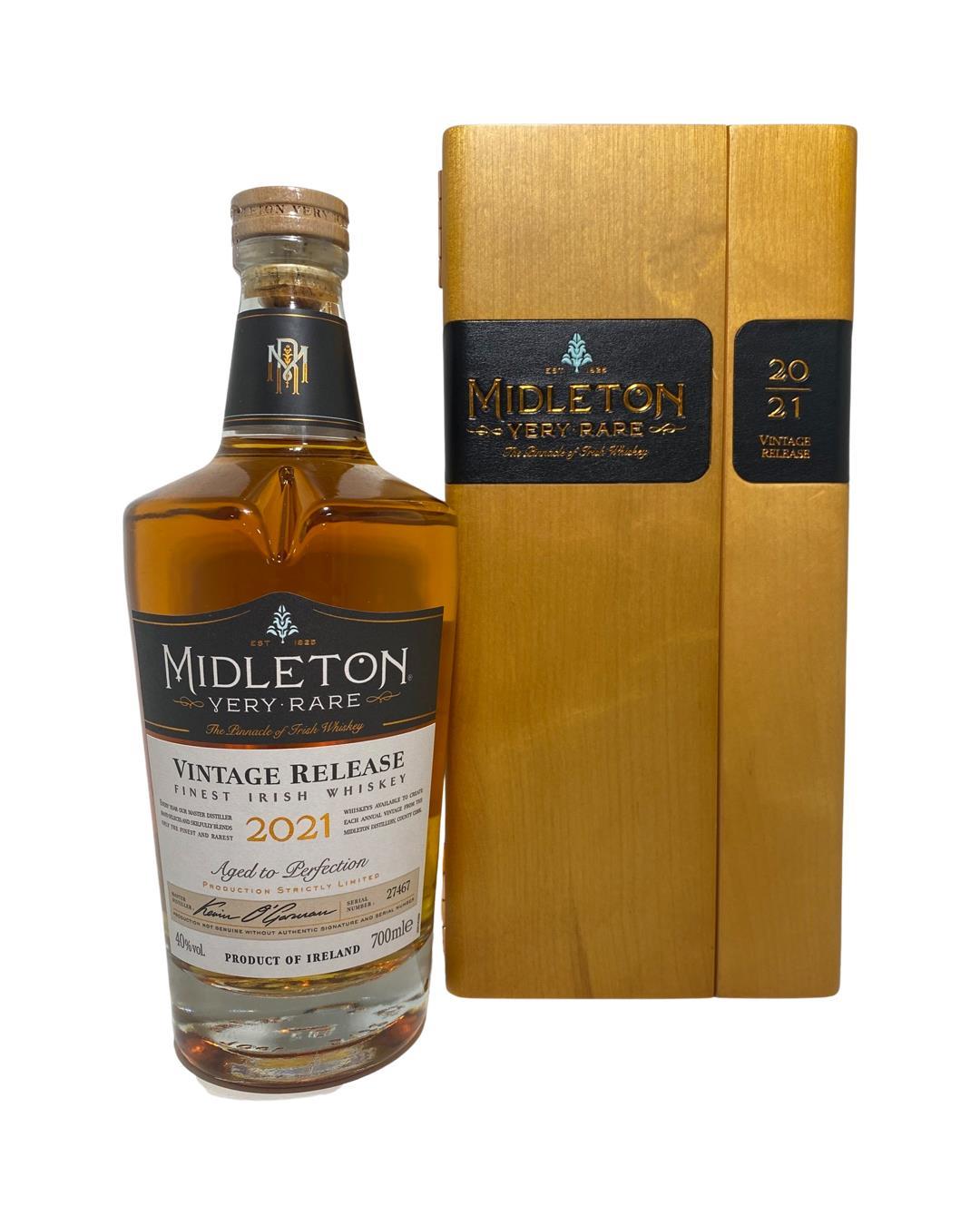 The 2021 edition to Ireland's most premium and beloved whiskey series; Midleton Very Rare. This is the 38th installment and the first release under Kevin O' Gorman appointed Master Distiller of the Midleton Distillery in 2020. Both the bottle and gift box are in very good condition, certificate and distillery invite are also included.  The Midleton Very Rare range of whiskeys is a collection of highly regarded Irish whiskeys crafted at the Midleton Distillery in County Cork, Ireland. With a reputation for excellence, these whiskeys are known for their exceptional quality, craftsmanship, and limited availability. Characterized by smoothness, complexity, and depth of flavour, Midleton Very Rare often exhibits notes of ripe fruits, honey, vanilla, spices, and oak. The component casks are typically aged for around 12-27 years but each yearly batch is unique and for this reason the whiskeys are highly collectible. To this day the Midleton Very Rare series is still regarded as the pinnacle and benchmark for ultra-premium blended Irish whiskeys.