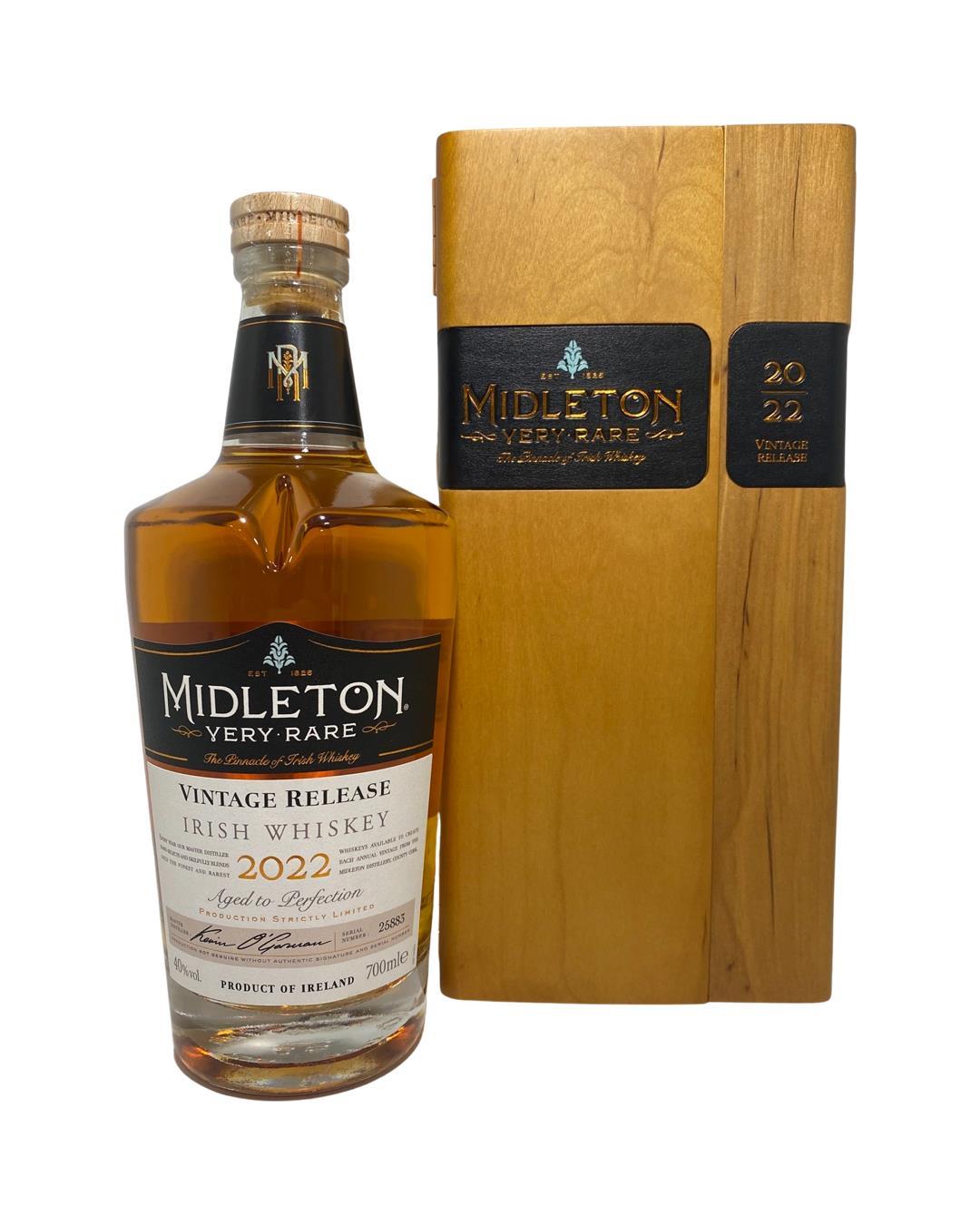 The 2022 edition to Ireland's most premium and beloved whiskey series; Midleton Very Rare. This is the 39th installment and the first release under Kevin O' Gorman appointed Master Distiller of the Midleton Distillery in 2020. Both the bottle and gift box are in very good condition, certificate and distillery invite are also included.