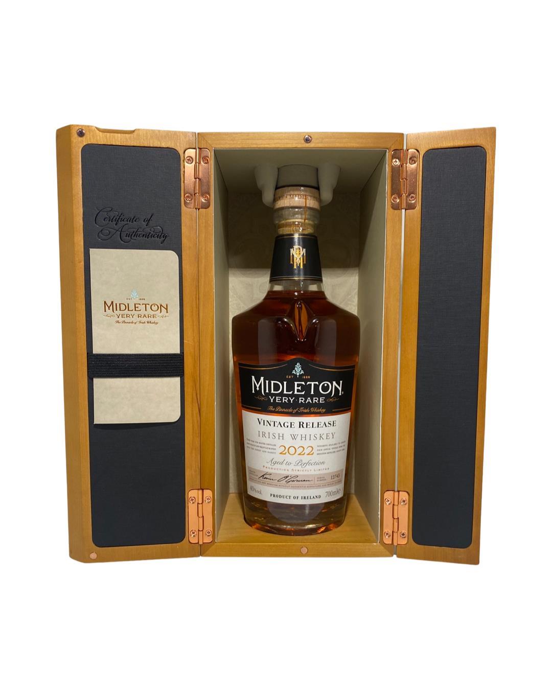 The 2022 edition to Ireland's most premium and beloved whiskey series; Midleton Very Rare. This is the 39th installment and the first release under Kevin O' Gorman appointed Master Distiller of the Midleton Distillery in 2020. Both the bottle and gift box are in very good condition, certificate and distillery invite are also included.