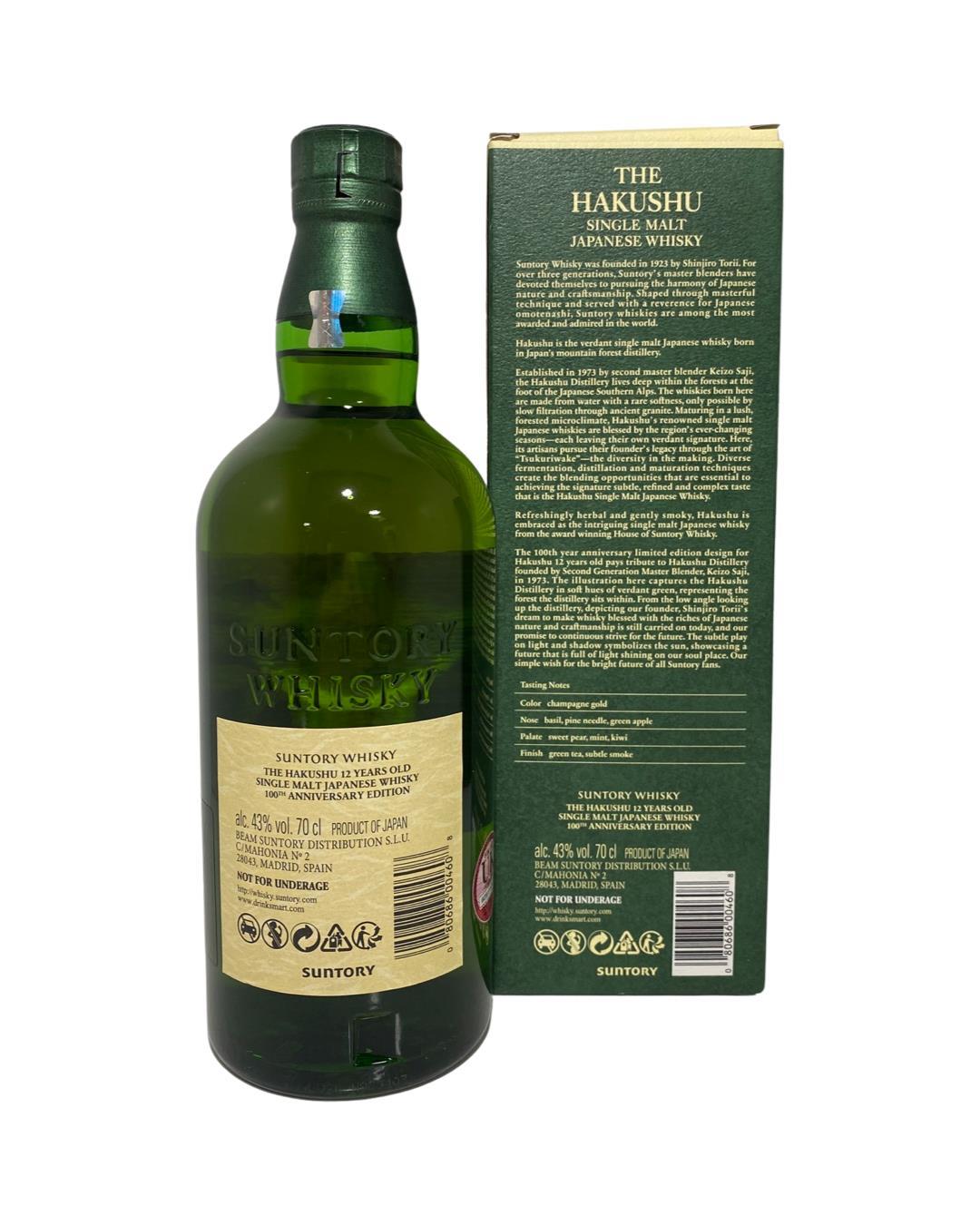 100th Anniversary Limited Edition Design. The Hakushu 12 Single Malt is made up of carefully selected malt whiskies all aged for a minimum of 12 years in various casks, created in honor of Suntory Whisky's centenary.The illustration on the bottle captures the Hakushu distillery in soft hues of verdant green, representing the forest surrounding the distillery.
