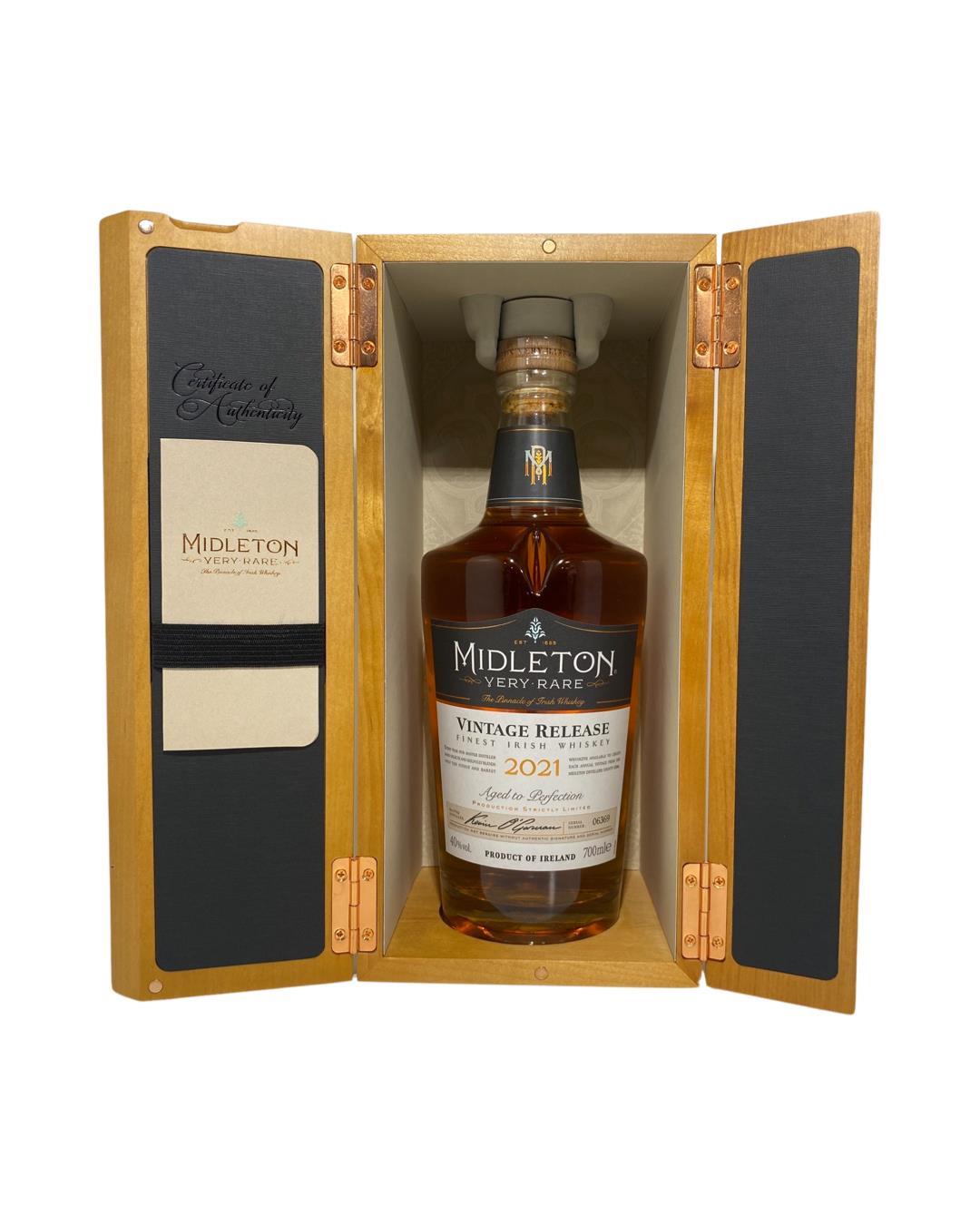 The 2021 edition to Ireland's most premium and beloved whiskey series; Midleton Very Rare. This is the 38th installment and the first release under Kevin O' Gorman appointed Master Distiller of the Midleton Distillery in 2020. Both the bottle and gift box are in very good condition, certificate and distillery invite are also included. The Midleton Very Rare range of whiskeys is a collection of highly regarded Irish whiskeys crafted at the Midleton Distillery in County Cork, Ireland. With a reputation for excellence, these whiskeys are known for their exceptional quality, craftsmanship, and limited availability. Characterized by smoothness, complexity, and depth of flavour, Midleton Very Rare often exhibits notes of ripe fruits, honey, vanilla, spices, and oak. The component casks are typically aged for around 12-27 years but each yearly batch is unique and for this reason the whiskeys are highly collectible. To this day the Midleton Very Rare series is still regarded as the pinnacle and benchmark for ultra-premium blended Irish whiskeys.