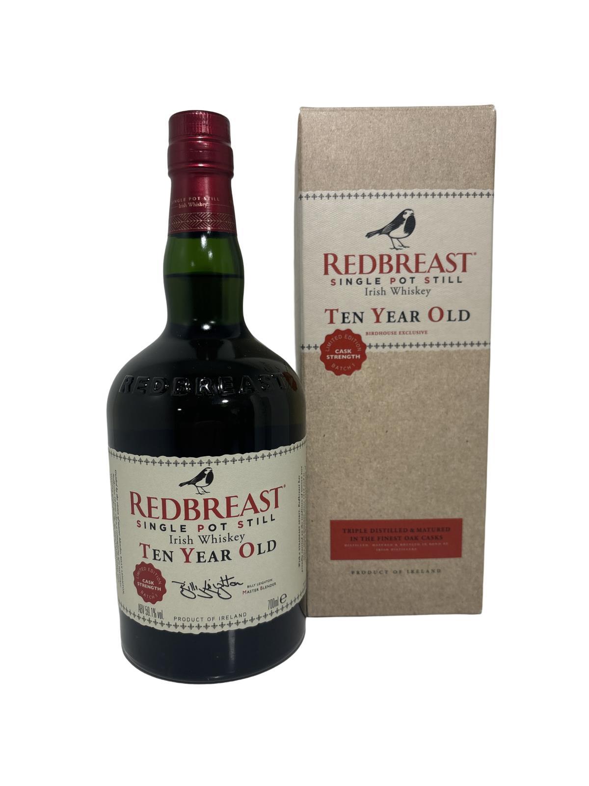 Redbreast 10 Year Old Cask Strength Batch No.1 .Distilled at the Redbreast distillery in Ireland, this triple distilled single pot still whisky was released to celebrate the 30th anniversary of the re-birth of Redbreast. Last released in the 1970s, this expression has been laid down to mature for a decade in a combination of Oloroso sherry butts and bourbon casks before being bottled at a cask strength of 59.1% abv. 700ml bottle.