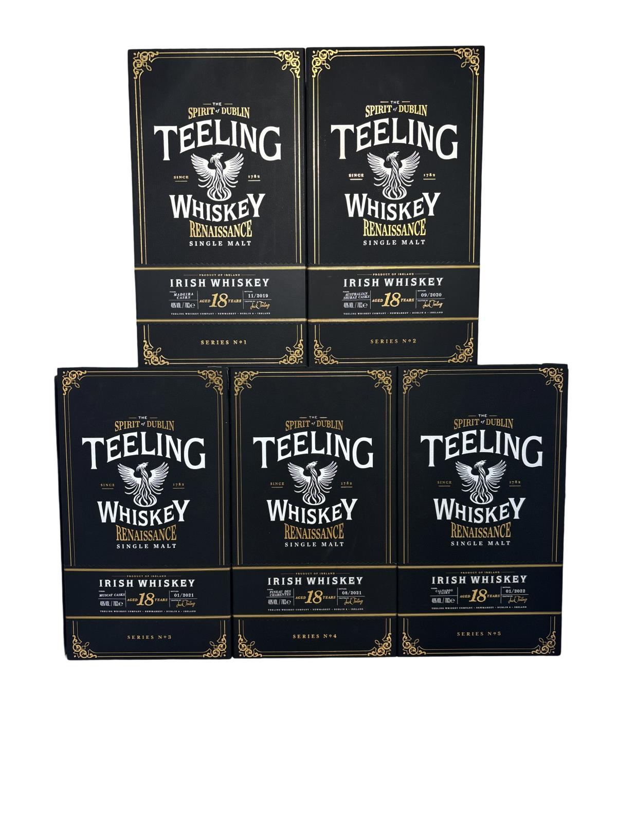 The teeling Renaissance collection is a 5 bottle series of 18 year old single malts each finished in a different cask. The first release of the Teeling Renaissance Series which has been matured in ex-Bourbon barrels then finished in Madeira casks for 18 months. This 18 Year Old Single Malt has rich flavours of toffee apples, dried fruits and a hint of Christmas spice. Limited to 9,000 bottles.The second release in the Teeling Renaissance Series. An 18 year old single malt whiskey initially aged in ex- Bourbon casks and finished for a period of no less than 18 months in Australian Shiraz barrels. Similarly to series one this batch is limited to just 9,000 bottles. The third release in the hugely popular Renaissance Series from Teeling. This has been aged for a total of 18 years with a final finishing period in Muscat wine casks. Offering a different style to the previous releases this is very much in the tropical fruit spectrum with mango, pineapple and citrus to the fore and even a touch of mint and pear drops. Following the success and acclaim of the Renaissance Series, Teeling has released the much anticipated Renaissance Series 4 at last! The Renaissance Series offers the very best Teeling has to offer and this release is no exception! For this expression, Teeling has matured in ex-bourbon barrels before receiving an extra maturation in ex-Pineau des Charentes casks which imparts flavours of mouth-watering pressed grapes, candied fruit, and pineapple character to the whiskey.The final installment in the Teeling Renaissance Series is here. Teeling Renaissance Series 5 is an 18 Year Old Single Malt that has been matured in ex-Bourbon barrels before receiving extra maturation in ex-Calvados casks imparting a beautiful range of sweet fruit flavours and soft spice.