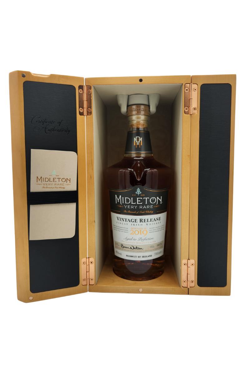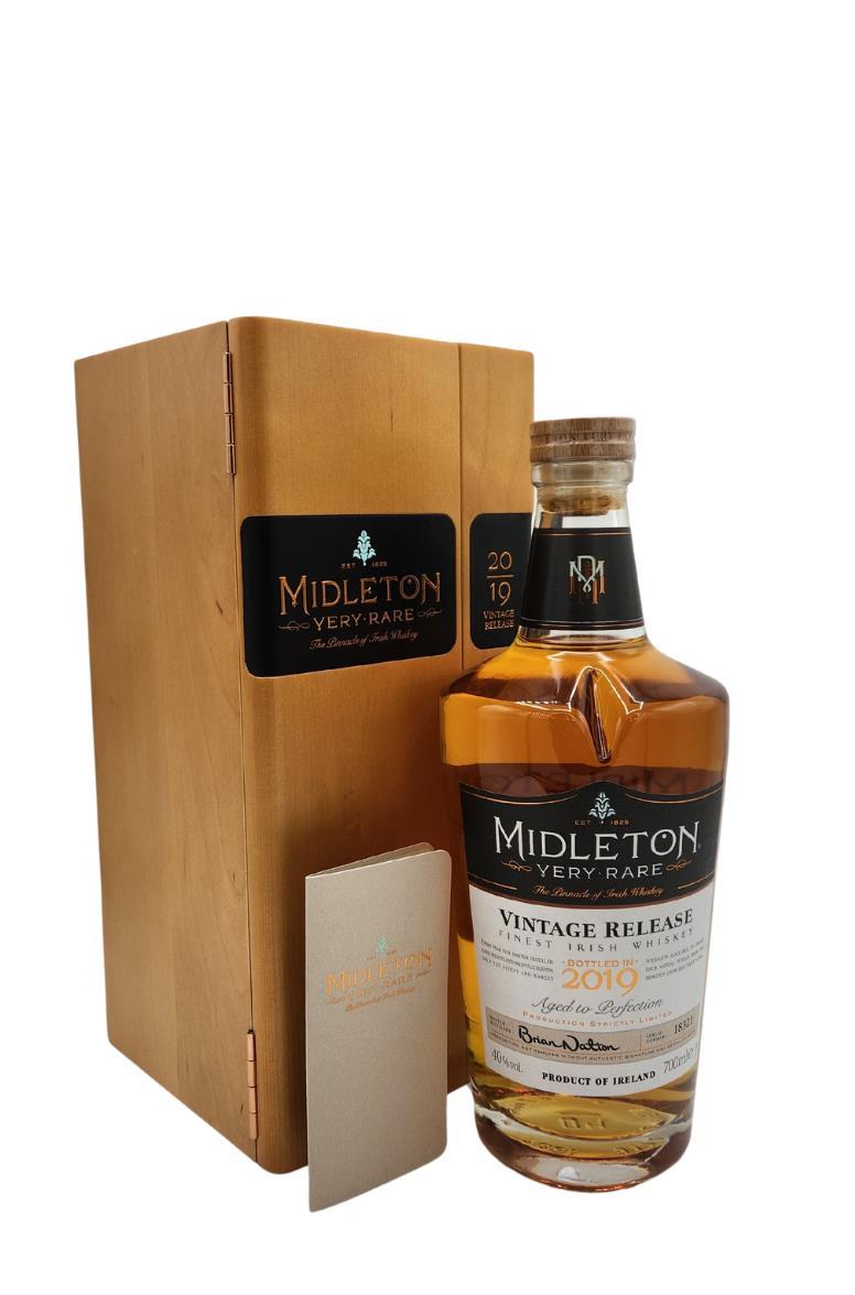 The Midleton Very Rare 2019, is a bottling brought out by the Midleton Distillery in Co. Cork. The ‘Midleton Very Rare’ range was launched in 1984 and a new vintage has been released every year since then. Barry Crockett started off the ‘Midleton Very Rare’ range while he was the Master Distiller of Midleton Distillery, in 2013 Barry Crockett retired from his role of Master Distiller. From 2014 onwards Brian Nation has been creating the ‘Midleton Very Rare’ range, maintaining its role as standard-bearer and pinnacle of Irish Whiskey. The bottle and gift box in great condition also include the cert and distillery invite.