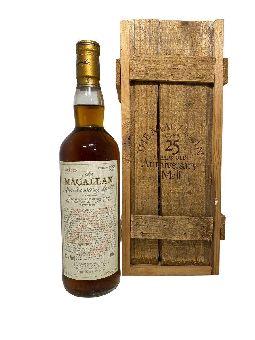 This rare 25 year old Speyside single malt was distilled at The Macallan in 1972 and bottled for their prestigious Anniversary Malt series in 1998.Comes in good condition with a beautiful wooden presentation box, this was bottled for the UK market and would be a great addition to any collection.
