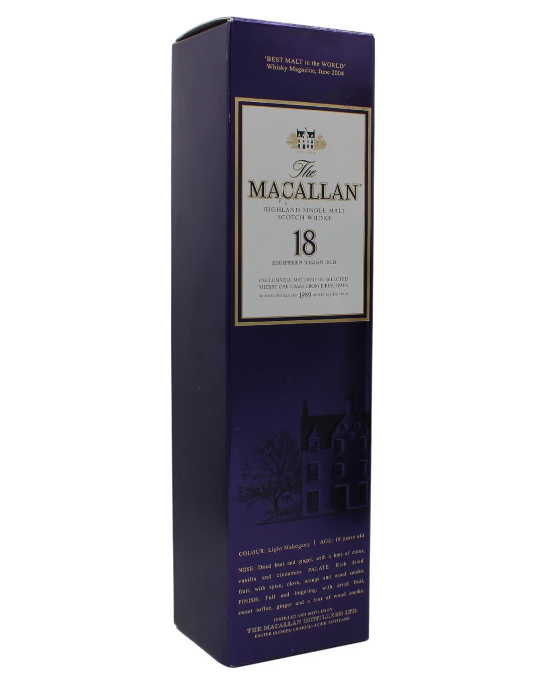 The Macallan 18 year old Speyside single malt distilled in 1989 and laid down at The Macallan distillery, was exclusively matured for more than 18 years in sherry wood casks from Jerez, Spain, before being bottled in 2007. The Macallan Distillery, located in Craigellachie, Scotland, is renowned for its exceptional single malt Scotch whiskies with a strong tradition of maturation in quality Sherry casks. A rich history dating back to 1824, Macallan has established itself as a symbol of luxury and craftsmanship. Nestled within the beautiful Speyside region, the distillery's stunning architectural design seamlessly blends with the surrounding landscape. Its unique production process combines traditional methods with cutting-edge technology, resulting in whiskies of unparalleled quality. ‘The Macallan’ stands as a symbol of excellence in the whisky world. Its whiskies are known for their complexity, craftsmanship, and attention to detail. From their core expressions to exclusive releases, Macallan continues to captivate whisky connoisseurs and collectors with its exceptional range of single malt Scotch whiskies.