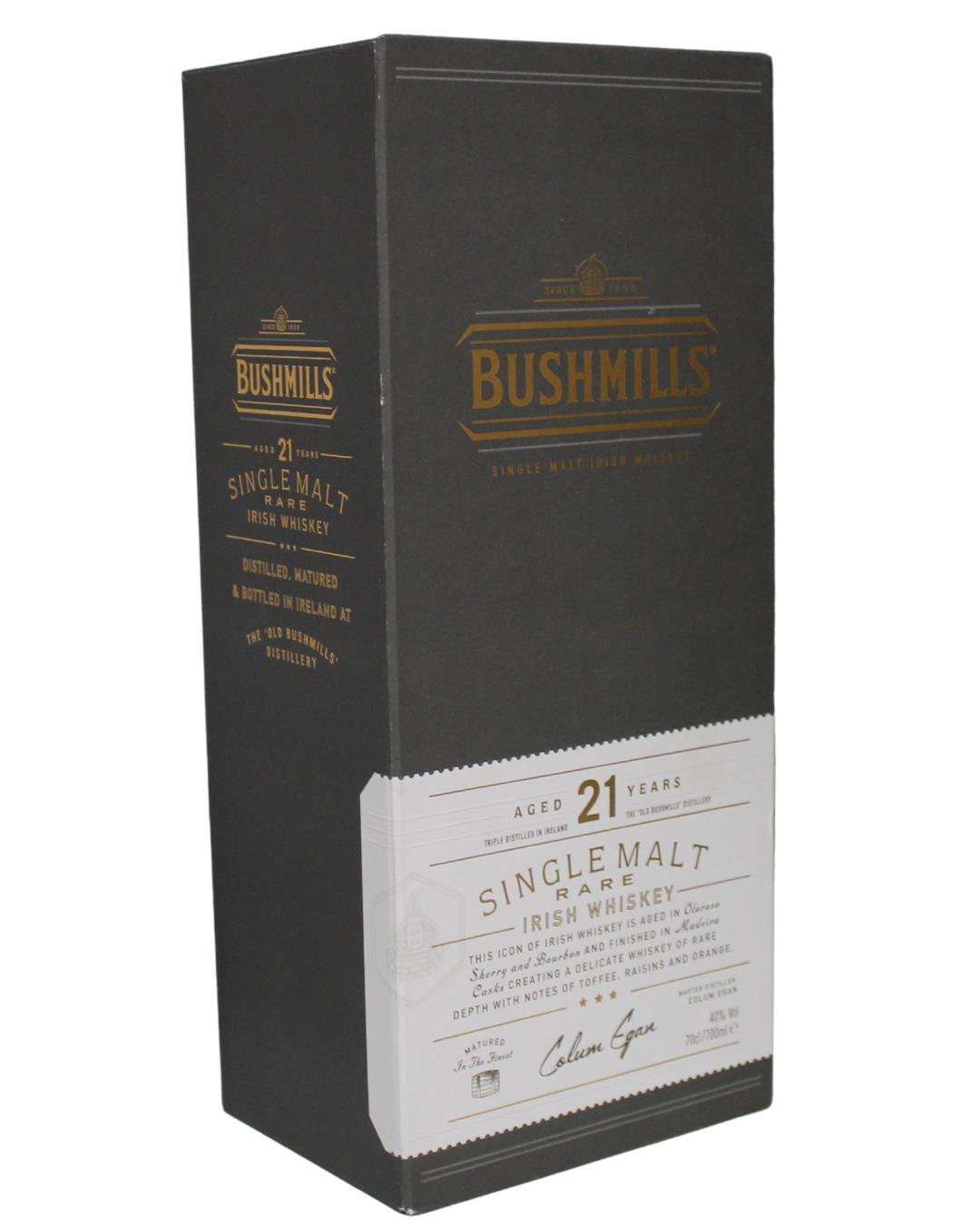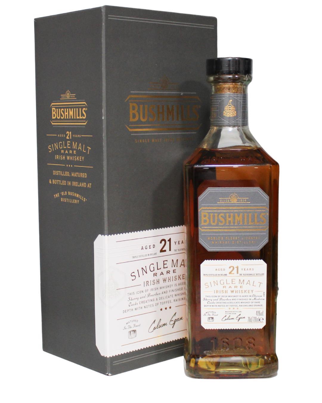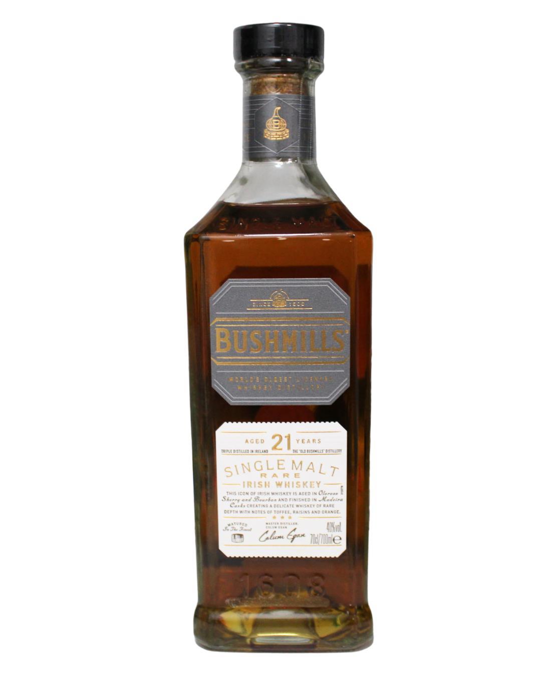 An icon of single malt Irish whiskey. Bushmills 21 Year Old is triple-casked: matured for at least 19 years in Oloroso sherry butts and bourbon barrels, then finished in majestic Madeira casks for a further two years. The unusually long finishing period of this complex whiskey creates deeper notes of dark chocolate, ripe fruit and sweet hazelnut.