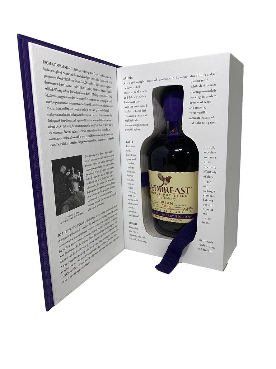When selecting their whiskey of choice for this fourth release, Leighton and Blender Dave McCabe combined innovation, tradition, and time-honoured craftsmanship by vatting together four special whiskeys, aged for a minimum of 29 years in ex-bourbon, sherry, and ruby port seasoned casks. The whiskeys were then married in a single outstanding Oloroso sherry butt from Jerez de la Frontera in Spain’s Andalusia region and left to mature for a further 15 months to bring an evolution of its characteristic flavours to the Redbreast experience. Having launched on world whiskey day only 914 bottles were made available. This is Bottle 140. The bottle and box are in great condition.