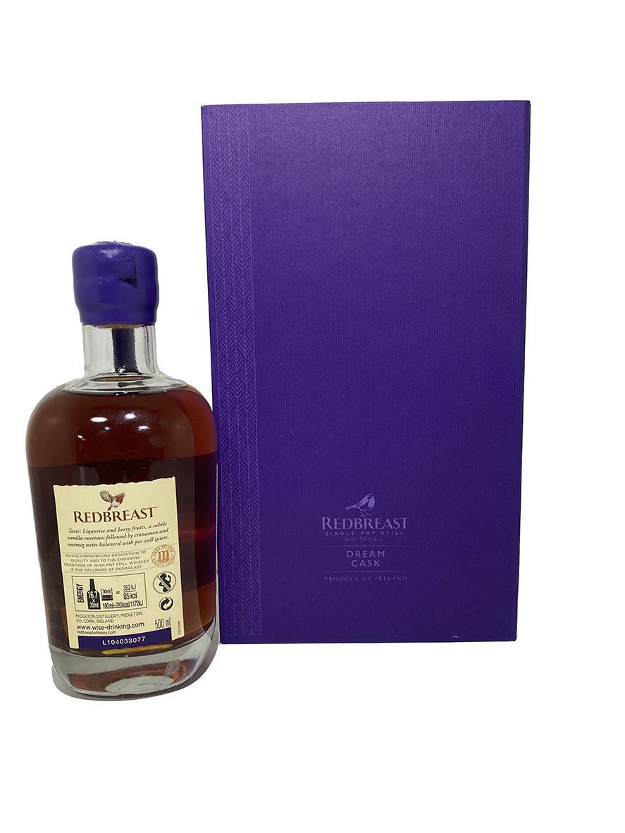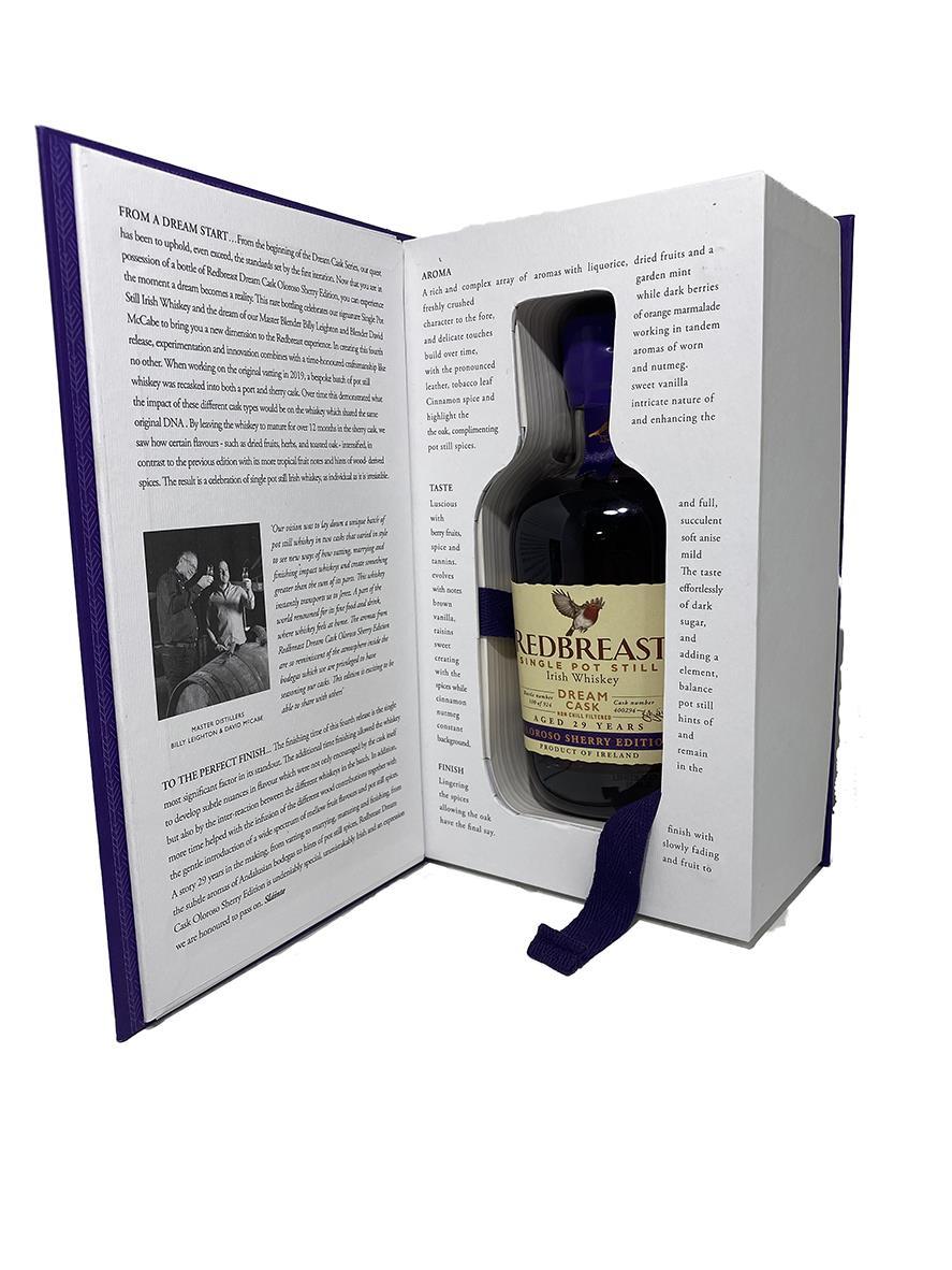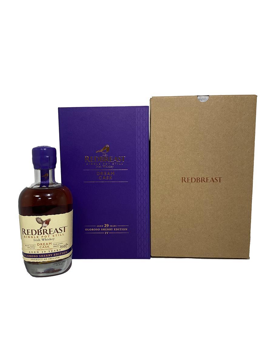 When selecting their whiskey of choice for this fourth release, Leighton and Blender Dave McCabe combined innovation, tradition, and time-honoured craftsmanship by vatting together four special whiskeys, aged for a minimum of 29 years in ex-bourbon, sherry, and ruby port seasoned casks. The whiskeys were then married in a single outstanding Oloroso sherry butt from Jerez de la Frontera in Spain’s Andalusia region and left to mature for a further 15 months to bring an evolution of its characteristic flavours to the Redbreast experience. Having launched on world whiskey day only 914 bottles were made available. This is Bottle 592. The bottle and box are in great condition.This comes with an extra Redbreast Shoebox style brown box that can been seen in the photos.