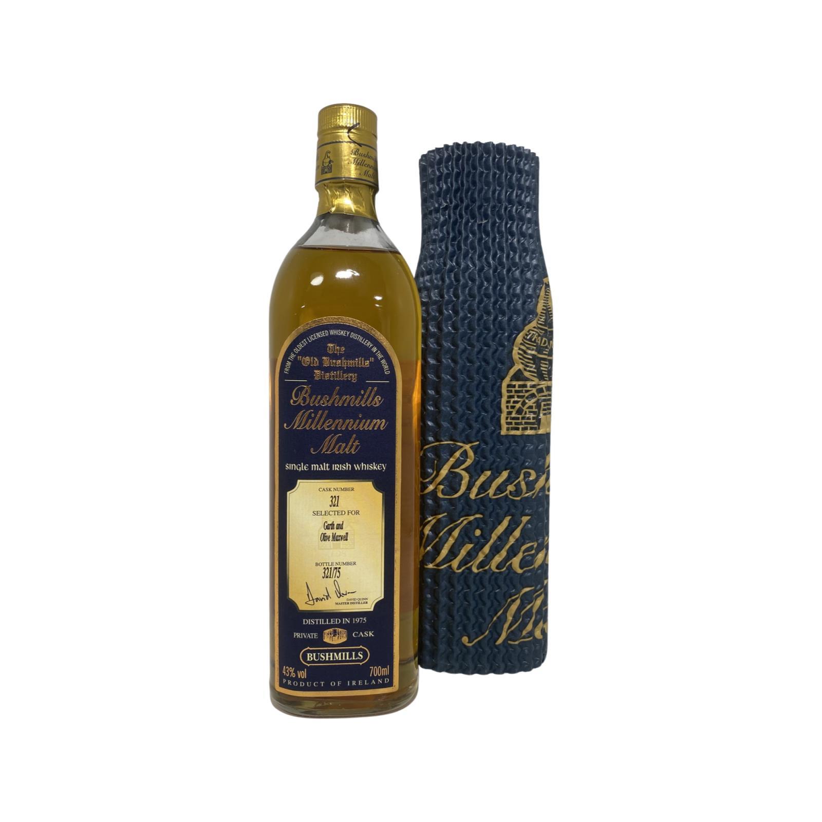 This bottle of Bushmills Millennium Single Malt was bottled around the Millennium and what resulted was the longest aged Bushmills whiskey available then, with this exceptional cask being 321.Bushmills Millennium Malt is a series of single cask bottlings from whiskey distilled in 1975 and matured in ex-Bourbon barrels. This unique Bushmills Millennium Malt has come straight from the cask, pure and unfiltered, following the ancient tradition that is whiskey making in Ireland. The addition of water, which flows over the basalt rock from St. Columbs Rill, to bring it to its bottled strength, is the only change Bushmills have made to your whiskey since it began the slow gentle process of maturation in your cask, back in 1975.
