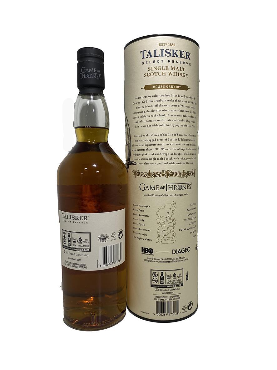 To celebrate the eighth and final season of the critically-acclaimed TV series, Game of Thrones, Diageo and HBO have released a limited-edition collection of Single Malt Scotch Whiskies. The collection features eight scotch whiskies, each paired with one of the iconic Houses of Westeros, as well as the Night's Watch, giving fans an authentic taste of the Seven Kingdoms and beyond.Included within the Game of Thrones Single Malt Scotch Whisky Collection are the following:Game of Thrones House Greyjoy 70cl - Talisker Select Reserve, Game of Thrones House Targaryen 70cl - Cardhu Gold Reserve,Game of Thrones House Lannister 70cl - Lagavulin 9 Year Old,Game of Thrones House Baratheon 70cl - Royal Lochnagar 12 Year Old,Game of Thrones House Tyrell 70cl - Clynelish Reserve,Game of Thrones House Tully 70cl - Singleton of Glendullan Select,Game of Thrones House Stark 70cl - Dalwhinnie Winter's Frost,Game of Thrones The Night's Watch 70cl - Oban Bay Reserve.