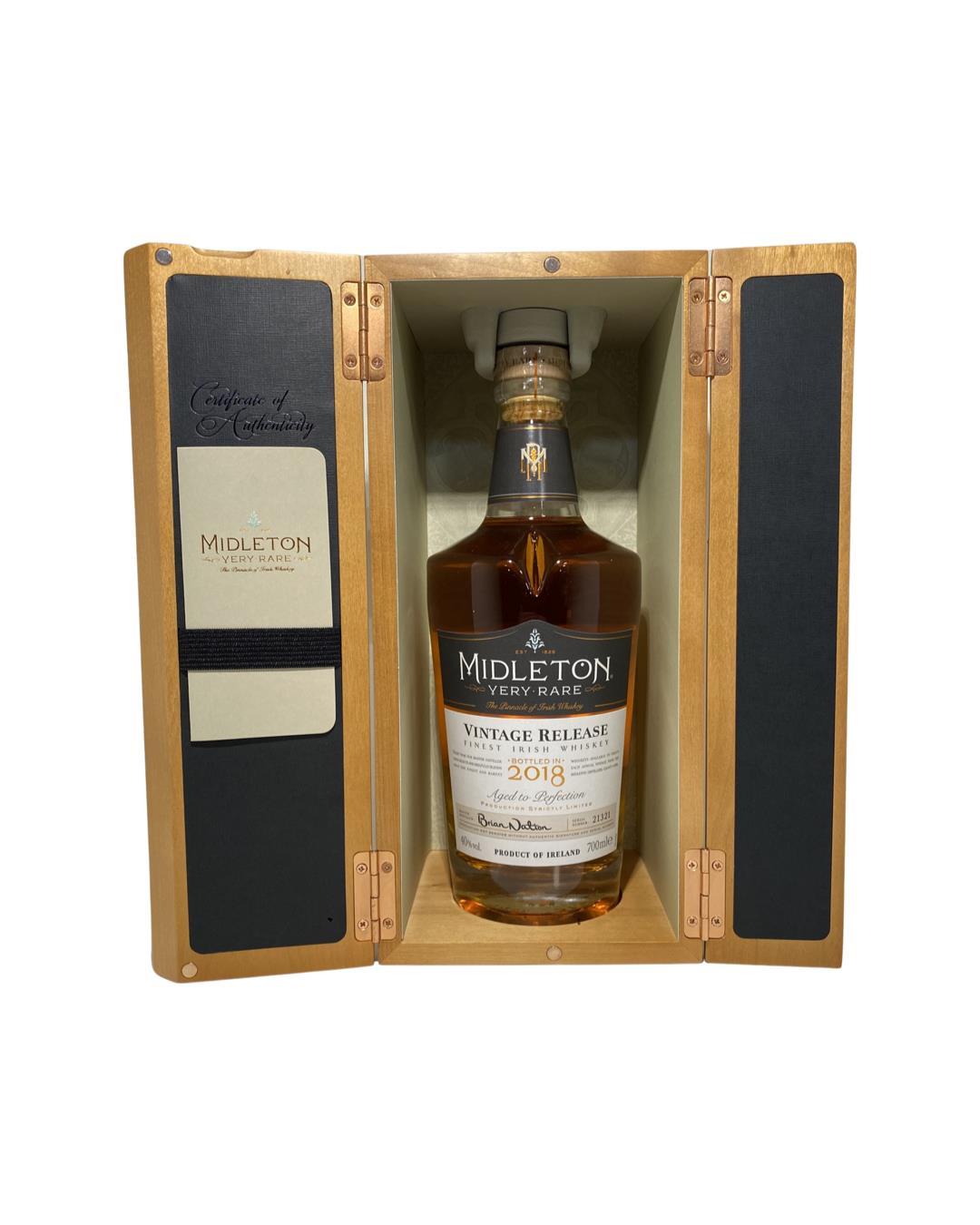 The Midleton Very Rare 2018, is a bottling brought out by the Midleton Distillery in Co. Cork. The ‘Midleton Very Rare’ range was launched in 1984 and a new vintage has been released every year since then. Barry Crockett started off the ‘Midleton Very Rare’ range while he was the Master Distiller of Midleton Distillery, in 2013 Barry Crockett retired from his role of Master Distiller. From 2014 onwards Brian Nation has been creating the ‘Midleton Very Rare’ range, maintaining its role as standard-bearer and pinnacle of Irish Whiskey. The bottle and gift box in great condition also include the cert and distillery invite. Bottle number 21321