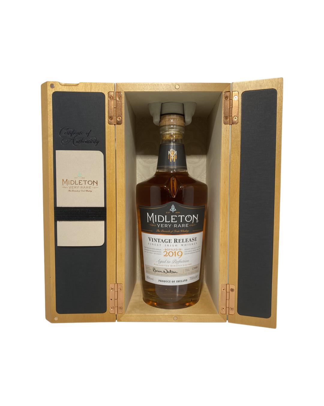 The Midleton Very Rare 2019 is part of the Midleton Very Rare collection that began in 1984 whereby a new vintage is released every year. The bottle and box are in very good condition, the certificate and distillery invite are both included. Bottle Number 13988
