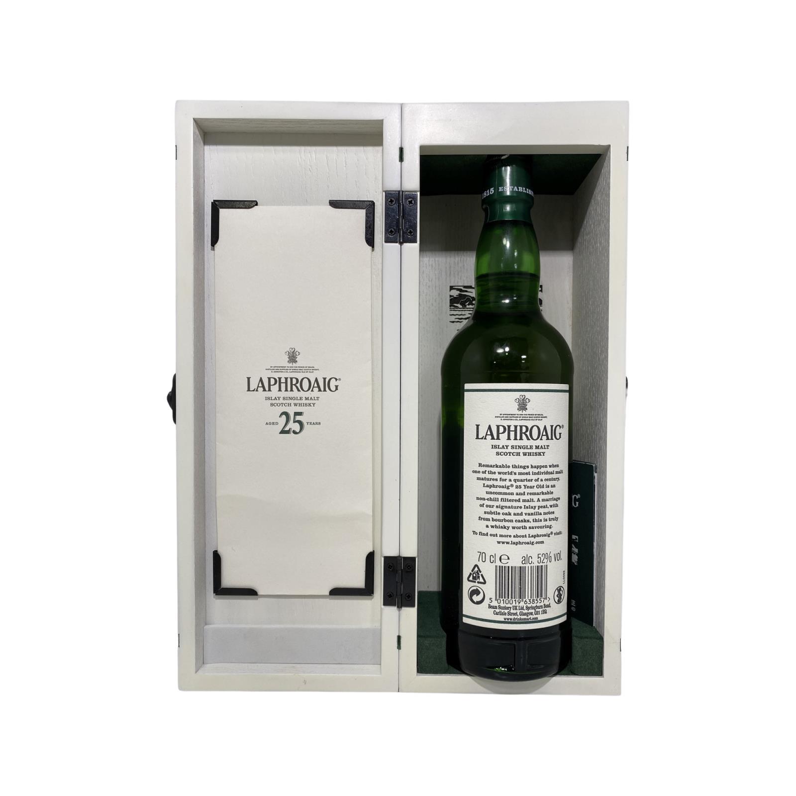 This expression is aged for a quarter century in a combination of large Oloroso sherry butts and ex-Bourbon barrels, proving that good things are worth the wait. This mellow single malt Scotch has the distinctive flavor of Laphroaig — peat smoke with a medicinal edge — met by creamy vanilla flavors from American oak and spiced apple from the sherry casks.