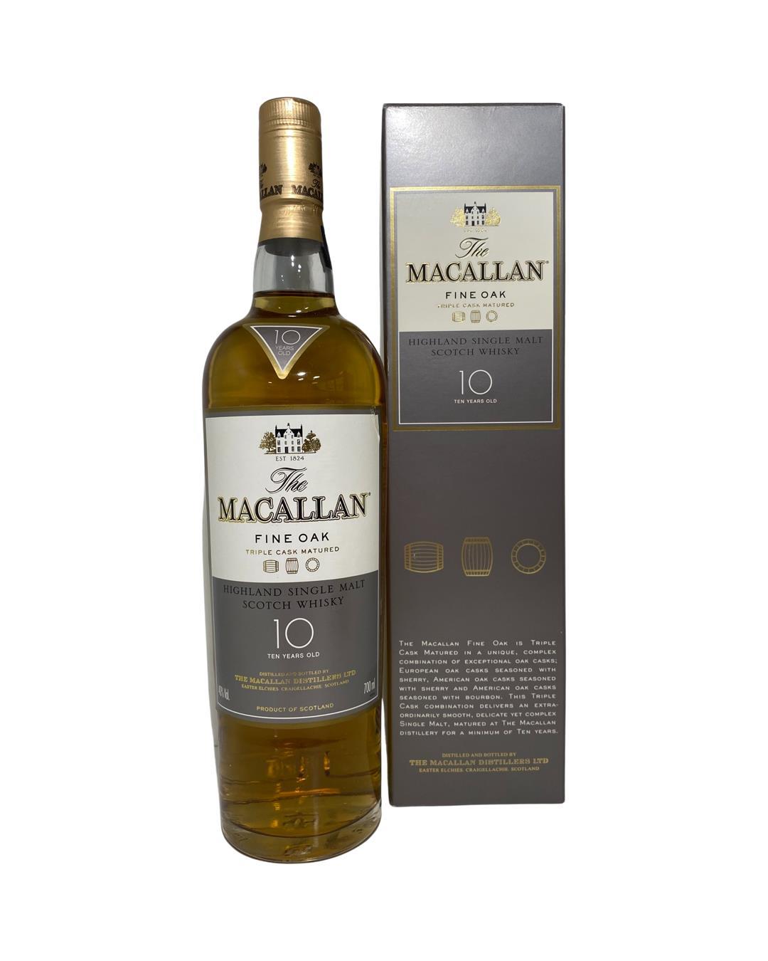 The Macallan Fine Oak 10 Years Old forms part of the Fine Oak range and is matured for a minimum of ten years in three exceptional oak cask types. This complex combination of casks delivers a light whisky with notes of honey and fruit.The Macallan Distillery, located in Craigellachie, Scotland, is renowned for its exceptional single malt Scotch whiskies with a strong tradition of maturation in quality Sherry casks. A rich history dating back to 1824, Macallan has established itself as a symbol of luxury and craftsmanship. Nestled within the beautiful Speyside region, the distillery's stunning architectural design seamlessly blends with the surrounding landscape. Its unique production process combines traditional methods with cutting-edge technology, resulting in whiskies of unparalleled quality. ‘The Macallan’ stands as a symbol of excellence in the whisky world. Its whiskies are known for their complexity, craftsmanship, and attention to detail. From their core expressions to exclusive releases, Macallan continues to captivate whisky connoisseurs and collectors with its exceptional range of single malt Scotch whiskies.