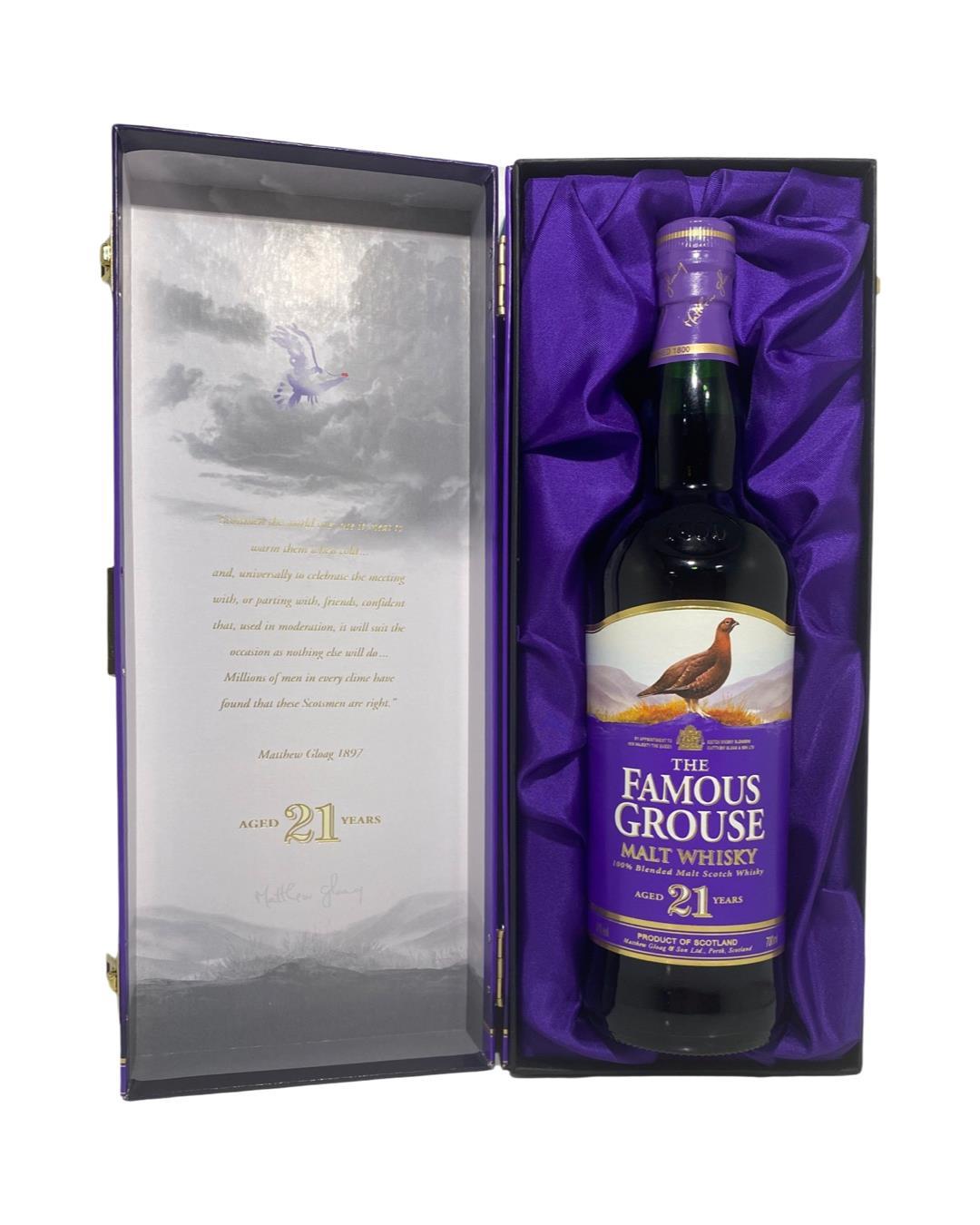 The Famous Grouse is a brand of blended Scotch whisky, first produced by Matthew Gloag & Son in 1896, and currently produced and owned by The Edrington Group. A 21 year old blended malt whisky, of the popular Famous Grouse in a purple presentation box. This is said to feature high class malts such as Macallan and Highland Park at its heart.