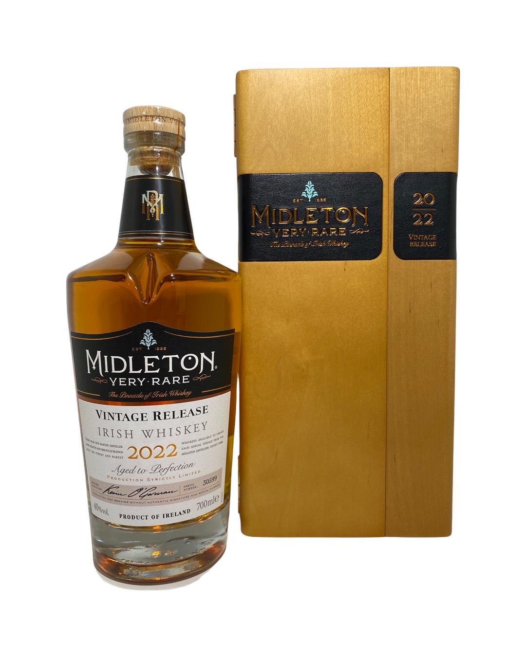 The 2022 edition to Ireland's most premium and beloved whiskey series; Midleton Very Rare. This is the 39th installment and the first release under Kevin O' Gorman appointed Master Distiller of the Midleton Distillery in 2020. Both the bottle and gift box are in very good condition, certificate and distillery invite are also included.