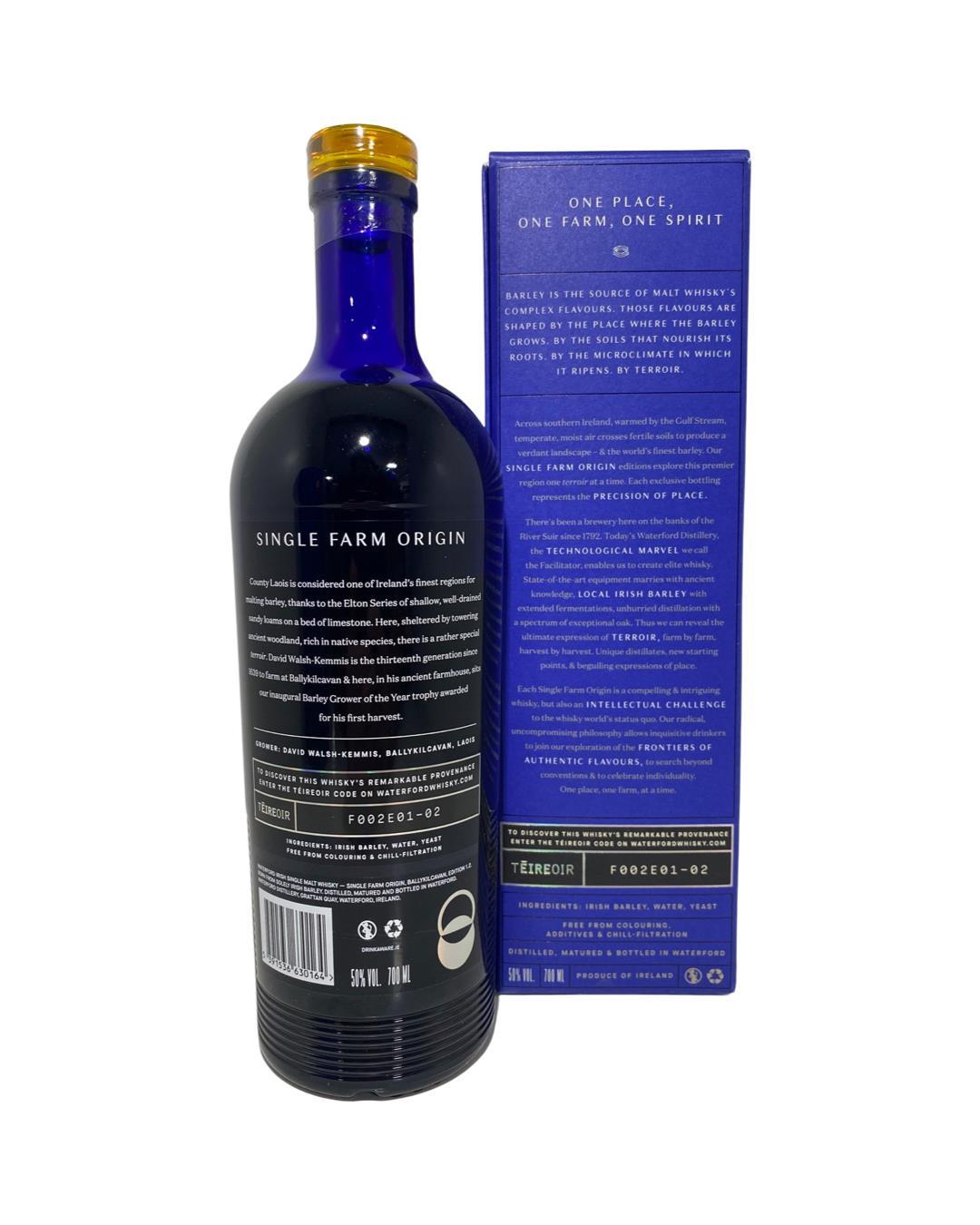 Ballykilcavan 1.2 - the second release, now 3 months older, uses barley grown by David Walsh-Kemmis west of the Barrow in Co. Laois in the barley heartlands, where his fertile fields are sheltered by ancient woodland. Located in the former Guinness Brewery on the banks of the River Suir, Waterford Distillery was founded in 2015 and has built a reputation for crafting whiskeys with an emphasis on ‘Terroir’ and the geographical sourcing of individual batches of barley.