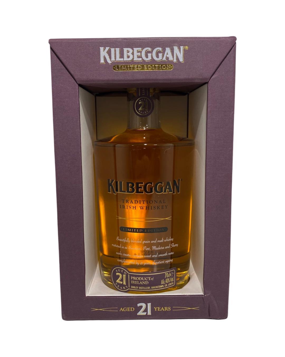 Kilbeggan 21 year old is a limited edition bottling of the oldest blended Irish whiskey from the Kilbeggan Distilling Co. Specially selected by Master blender Noel Sweeney, this beautifully blended grain and malt whiskey has been matured in ex-Bourbon, Port, Madeira and Sherry casks creating complex sweet and smooth notes complemented by 21 years of patient ageing.