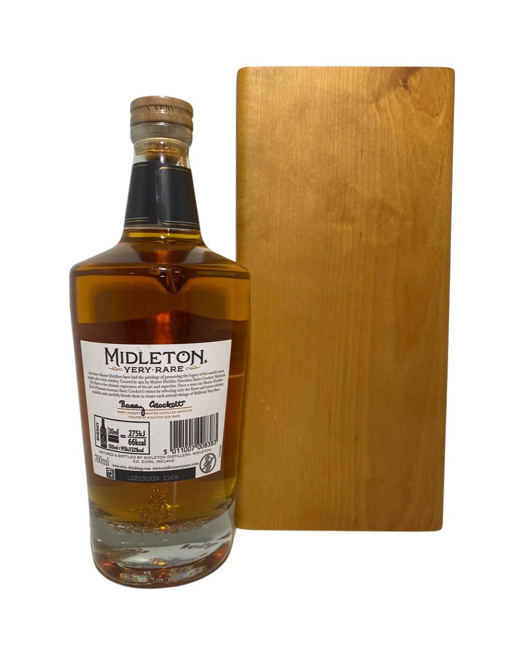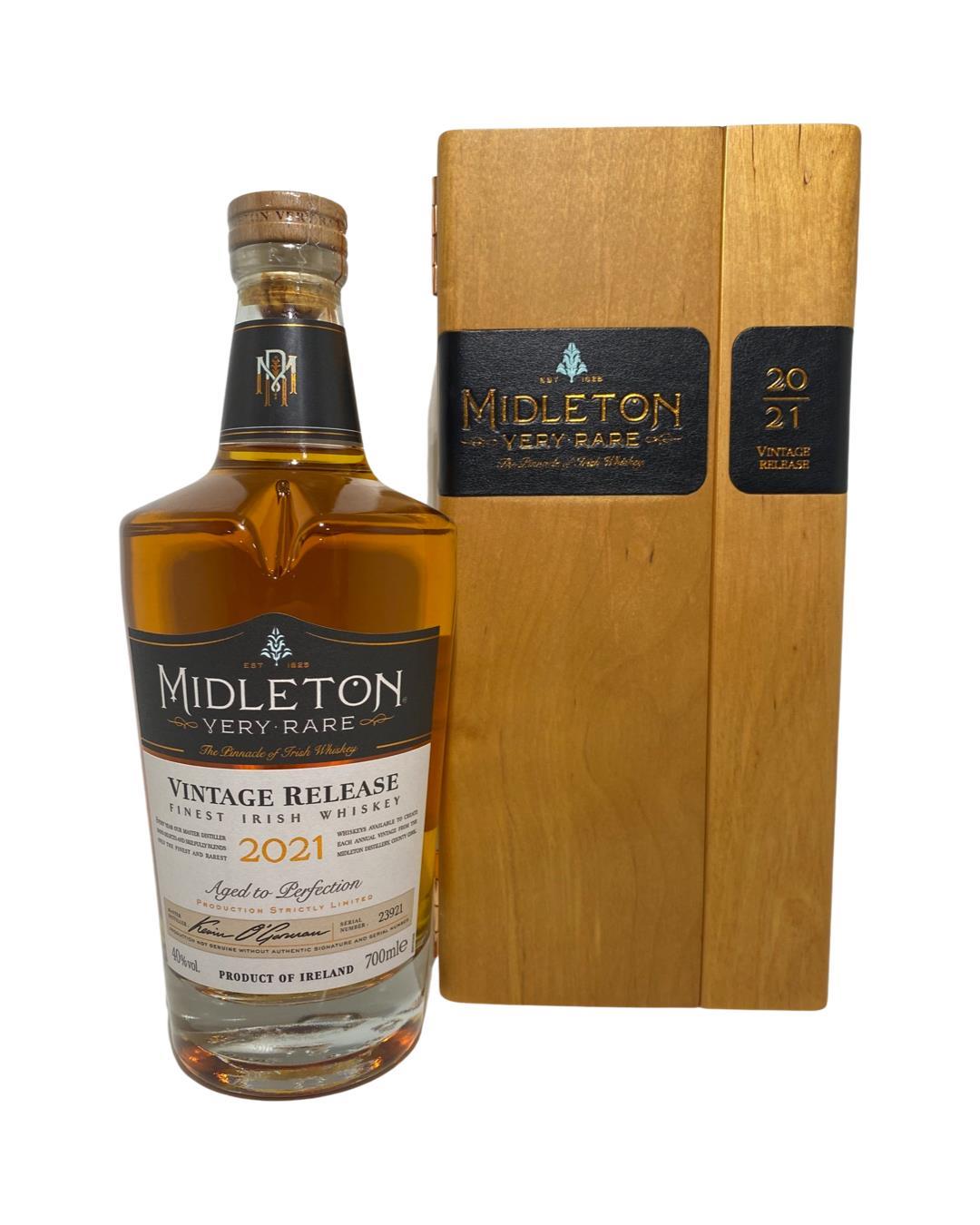 The 2021 edition to Ireland's most premium and beloved whiskey series; Midleton Very Rare. This is the 38th installment and the first release under Kevin O' Gorman appointed Master Distiller of the Midleton Distillery in 2020. Both the bottle and gift box are in very good condition, certificate and distillery invite are also included.  The Midleton Very Rare range of whiskeys is a collection of highly regarded Irish whiskeys crafted at the Midleton Distillery in County Cork, Ireland. With a reputation for excellence, these whiskeys are known for their exceptional quality, craftsmanship, and limited availability. Characterized by smoothness, complexity, and depth of flavour, Midleton Very Rare often exhibits notes of ripe fruits, honey, vanilla, spices, and oak. The component casks are typically aged for around 12-27 years but each yearly batch is unique and for this reason the whiskeys are highly collectible. To this day the Midleton Very Rare series is still regarded as the pinnacle and benchmark for ultra-premium blended Irish whiskeys.