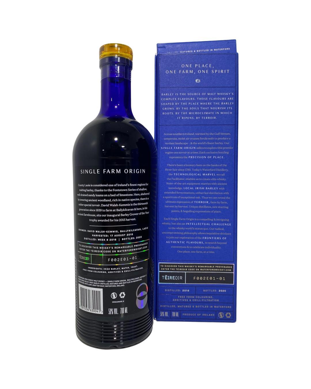 Ballykilcavan is the second ever barley supplier to be distilled for Waterford whiskies Single farm distillation. Based near Stadbally in Co laois it is said to be one of the best areas in the country to produce barely with its unique terroir providing all the best required nutrients and protections that the barley needs. A whiskey that tastes of Cooked bananas with brown sugar, and plenty of heat. Mulled wine and cinnamon. Along with a dry, oily lasting finish. cetainly a young whisjey with a great flavour. Located in the former Guinness Brewery on the banks of the River Suir, Waterford Distillery was founded in 2015 and has built a reputation for crafting whiskeys with an emphasis on ‘Terroir’ and the geographical sourcing of individual batches of barley. The distillery is the brainchild of Mark Reynier who was famously responsible for the resurrection of Bruichladdich distillery on Islay in Scotland. The pot stills at Waterford were originally part of the Inverleven Distillery on Clydeside and had been rescued by Mark just in case he found a use for them in the future. Additionally there is some hi-tech kit at the distillery including a mash filter and other state of the art equipment. Bottlings feature an emphasis on barley and its origins and the distillery uses a mix of casks for maturation including American oak and various types of French oak.