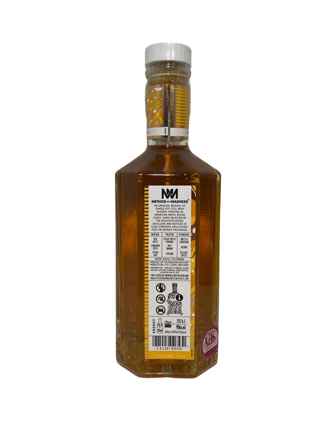 A limited-edition single pot still Irish whiskey from Method and Madness. Initially matured in a combination of ex-bourbon and ex-sherry casks, it was then finished in specially-selected Maple wood casks.