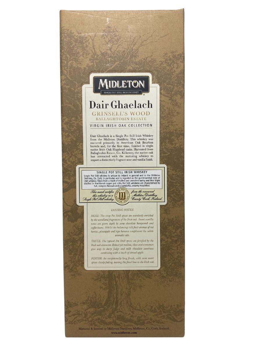 Midleton Dair Ghaelach, is the first ever Irish whiskey to be finished in virgin Irish Oak Hogsheads. This uniquely Irish expression is the latest addition to the Midleton Single Pot Still family of whiskeys, satisfying the growing appetite among whisk(e)y lovers for discovering new and innovative styles of Single Pot Still Irish Whiskey. At Midleton, a selection of traditional Single Pot Still Irish Whiskey distillates, matured for between 15 and 22 years in ex-Bourbon casks, were married together before being filled into native Irish Oak Hogsheads harvested from 130 year old oak trees from Grinsell’s Wood, within the Ballaghtobin Estate in Co. Kilkenny.This special whiskey is the true and unique flavour of Ireland. Its provenance as individual as its fragrance, its journey from grain to glass as distinguished as its finish.