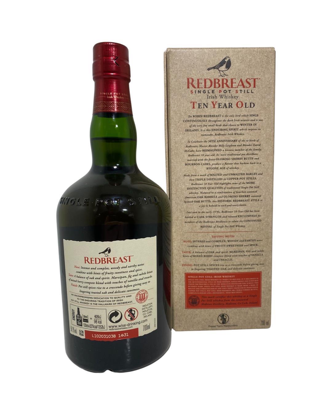 Redbreast 10 Year Old Cask Strength Batch No.1 .Distilled at the Redbreast distillery in Ireland, this triple distilled single pot still whisky was released to celebrate the 30th anniversary of the re-birth of Redbreast. Last released in the 1970s, this expression has been laid down to mature for a decade in a combination of Oloroso sherry butts and bourbon casks before being bottled at a cask strength of 59.1% abv. 700ml bottle.
