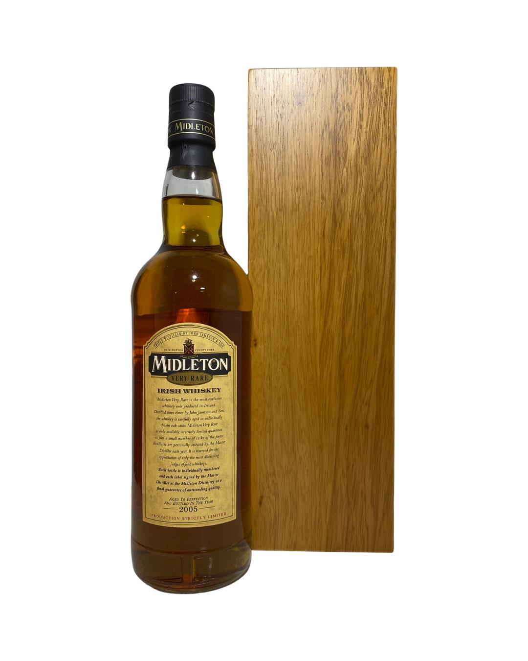 The Midleton Very Rare 2005, is a bottling brought out by the Midleton Distillery in Co. Cork. The ‘Midleton Very Rare’ range was launched in 1984 and a new vintage has been released every year since then. Barry Crockett started off the ‘Midleton Very Rare’ range while he was the Master Distiller of Midleton Distillery.The Bottle and Box are in good condition.  The Midleton Very Rare range of whiskeys is a collection of highly regarded Irish whiskeys crafted at the Midleton Distillery in County Cork, Ireland. With a reputation for excellence, these whiskeys are known for their exceptional quality, craftsmanship, and limited availability. Characterized by smoothness, complexity, and depth of flavour, Midleton Very Rare often exhibits notes of ripe fruits, honey, vanilla, spices, and oak. The component casks are typically aged for around 12-27 years but each yearly batch is unique and for this reason the whiskeys are highly collectible. To this day the Midleton Very Rare series is still regarded as the pinnacle and benchmark for ultra-premium blended Irish whiskeys.