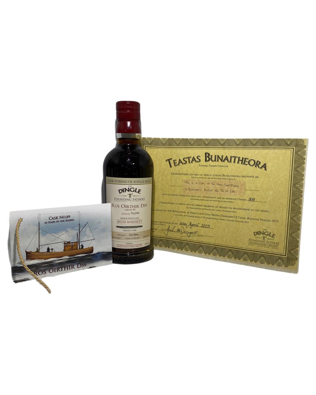 A Founding Fathers Cask Strength Single Malt from the Dingle Distillery that was aged exclusively in a sherry cask for 10 years.This is one of the few 10 year old releases currently on the market. It comes with a great post card with a picture of the boat that the bottling is named after and a copy of the original cask cetificate with the associated bottle number. This is cask 89. Established in 2012, Dingle has quickly gained recognition for its exceptional spirits and commitment to traditional craftsmanship. The distillery focuses on producing small-batch, handcrafted whiskies that embody the rich heritage of Irish whiskey-making. Concentrating on Single Pot Still and Single Malt whiskey production the company has won many awards in the short time it has been operating, whilst garnering a multitude of followers who are keen to sample the excellent small-batch releases. Dingle has recently started to bring out some semi-permanent releases as part of the ‘Celtic Series’ with each of these celebrating the seasonal Celtic festivals such as Samhain, La le Bride and Bealtaine.