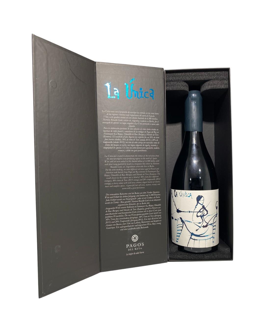La Única is a result of an exhaustive selection of different tempranillos tasted and analyzed by a team of 32 tasters of national and international prestige. The grape behind Rioja and widely planted in Spain in general. Tempranillo lends itself to significant oak ageing, it tastes of ripe. A blend assembled from three wines made by Pagos del Rey. The wines were all made from local clones of Tempranillo and the blend comprised of 50% Tinto Fino from Ribera del Duero (2011-2012-2013 vintages), 30% Tinta de Toro (2013 vintage) and 20% Tempranillo from Rioja (2012 vintage) to unify aroma and taste in one unique wine. Limited edition of 6,300 bottles, each with a unique hand painted label by contemporary artist Mariano Rinaldi Goni.