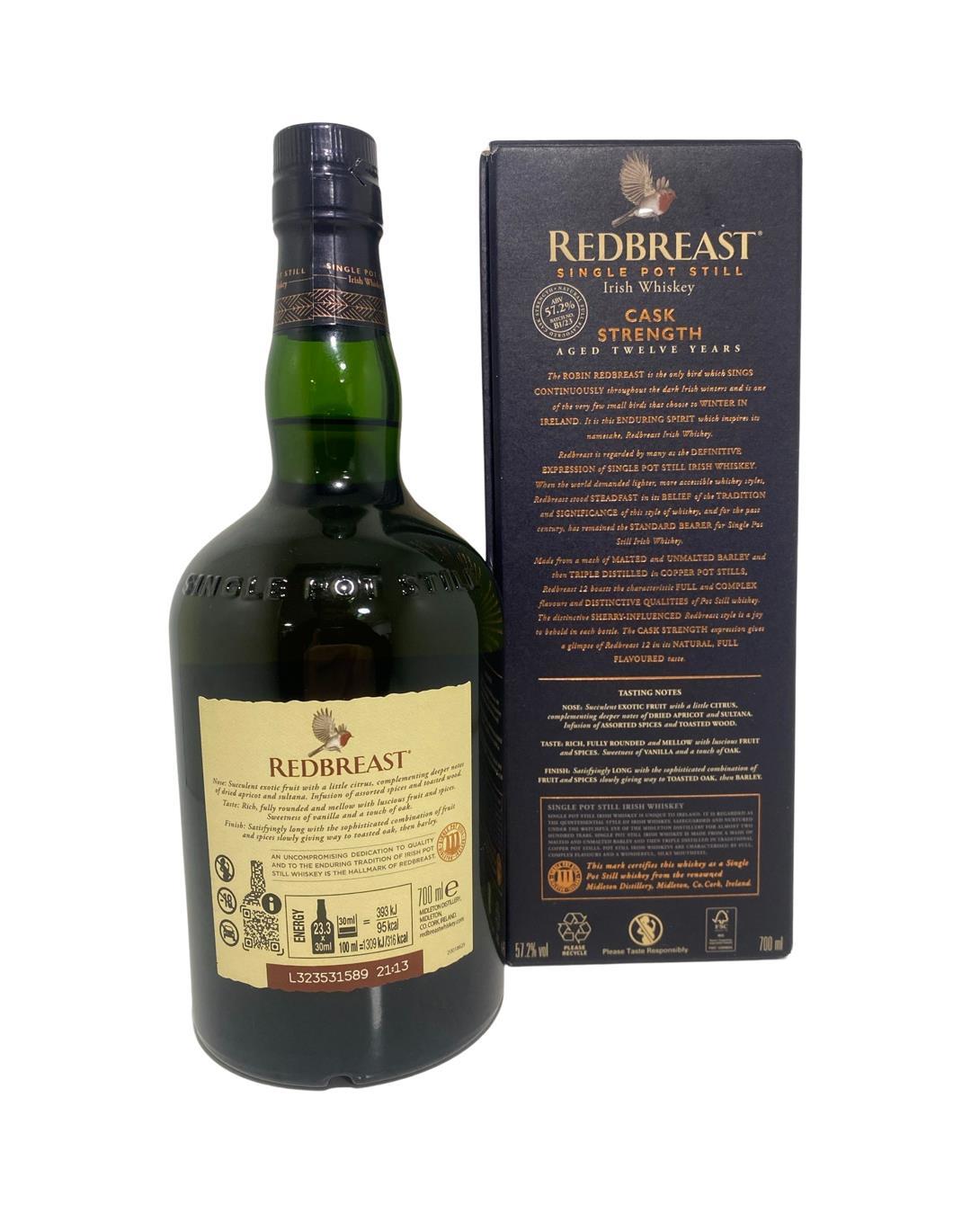 The award-winning Redbreast Cask Strength 12 Year Old. The Cask Strength has perhaps been one of the most favourably received and won 'Irish Whiskey of the Year' in the 2013 Irish Whiskey Awards. Most of the maturation is done in sherry casks but with careful selection so that the sherry character does not overpower the whiskey. The pot still content really shines through which explains why it has been winning so many awards.