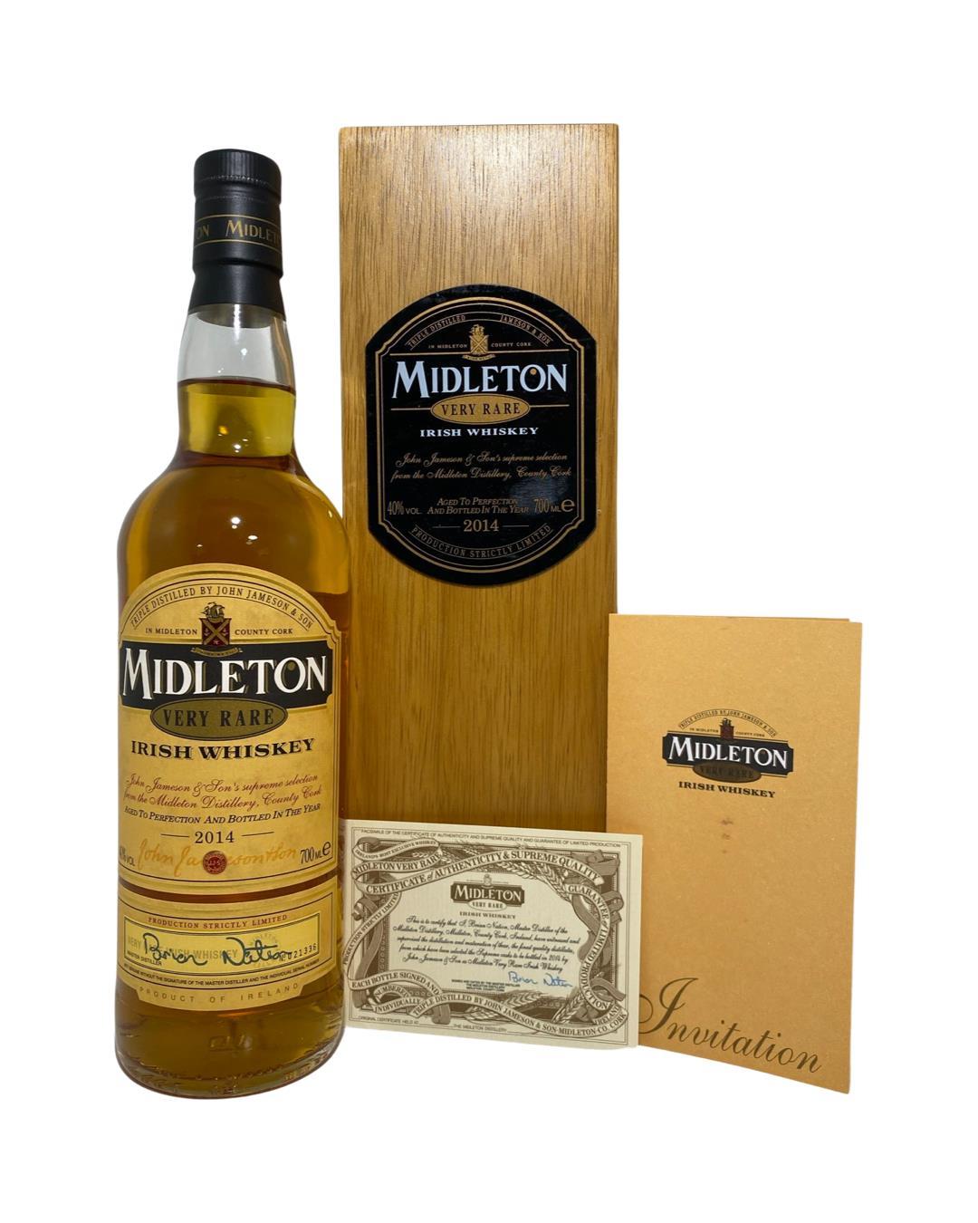 The Midleton Very Rare 2014, is a bottling brought out by the Midleton Distillery in Co. Cork. The ‘Midleton Very Rare’ range was launched in 1984 and a new vintage has been released every year since then. Barry Crockett started off the ‘Midleton Very Rare’ range while he was the Master Distiller of Midleton Distillery, in 2013 Barry Crockett retired from his role of Master Distiller. From 2014 onwards Brian Nation has been creating the ‘Midleton Very Rare’ range, maintaining its role as standard-bearer and pinnacle of Irish Whiskey. The bottle and gift box in great condition also include the cert and distillery invite.