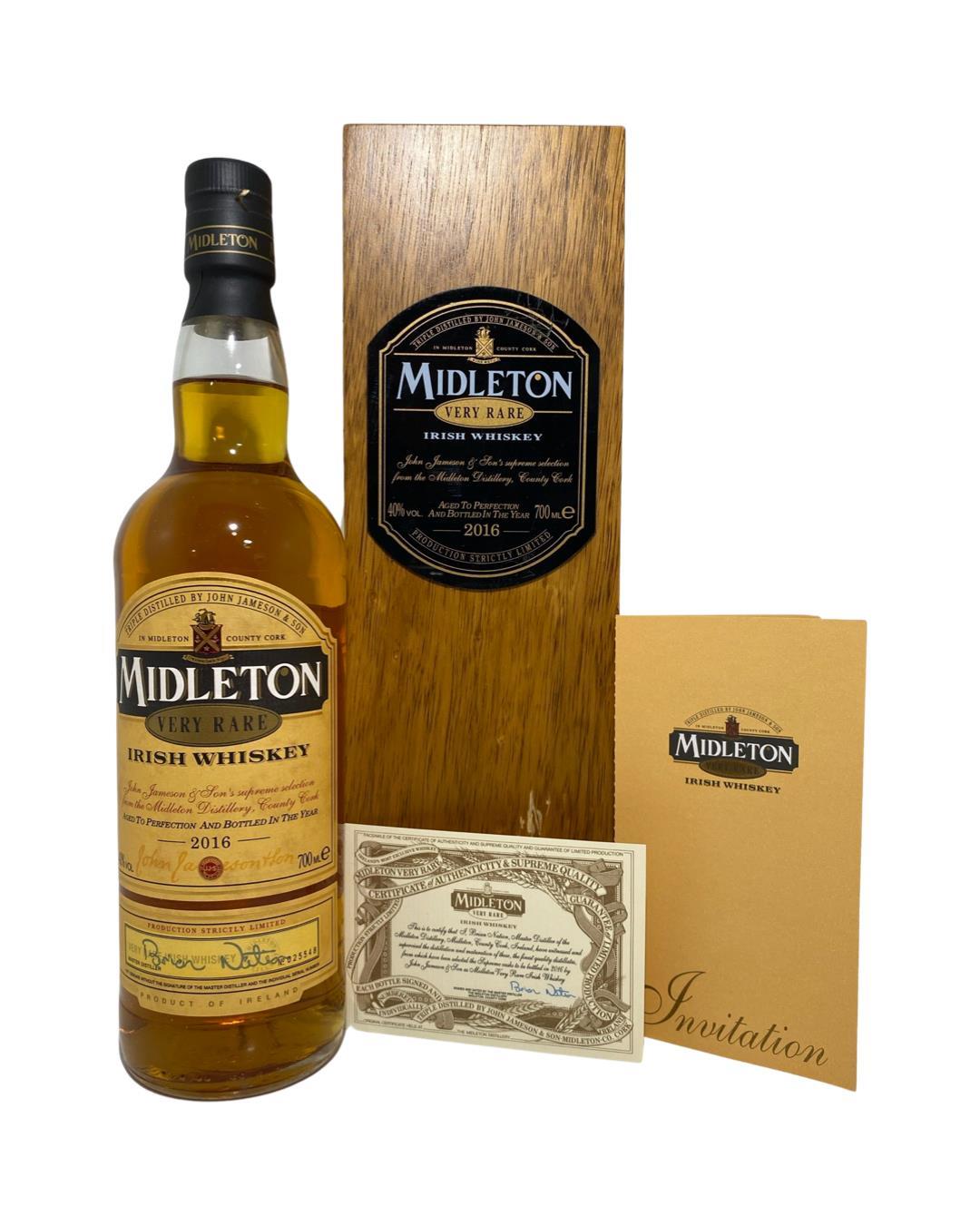 The Midleton Very Rare 2016, is a bottling brought out by the Midleton Distillery in Co. Cork. The ‘Midleton Very Rare’ range was launched in 1984 and a new vintage has been released every year since then. Barry Crockett started off the ‘Midleton Very Rare’ range while he was the Master Distiller of Midleton Distillery, The bottle and box are in excellent condition and include the distillery invite and certificate. The Midleton Very Rare range of whiskeys is a collection of highly regarded Irish whiskeys crafted at the Midleton Distillery in County Cork, Ireland. With a reputation for excellence, these whiskeys are known for their exceptional quality, craftsmanship, and limited availability. Characterized by smoothness, complexity, and depth of flavour, Midleton Very Rare often exhibits notes of ripe fruits, honey, vanilla, spices, and oak. The component casks are typically aged for around 12-27 years but each yearly batch is unique and for this reason the whiskeys are highly collectible. To this day the Midleton Very Rare series is still regarded as the pinnacle and benchmark for ultra-premium blended Irish whiskeys.