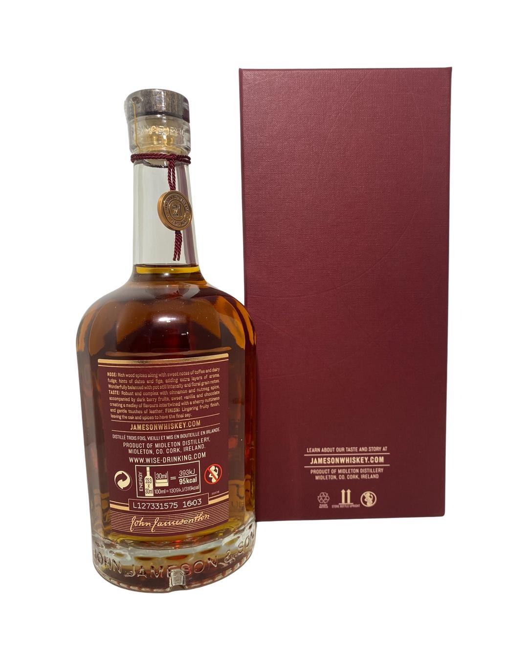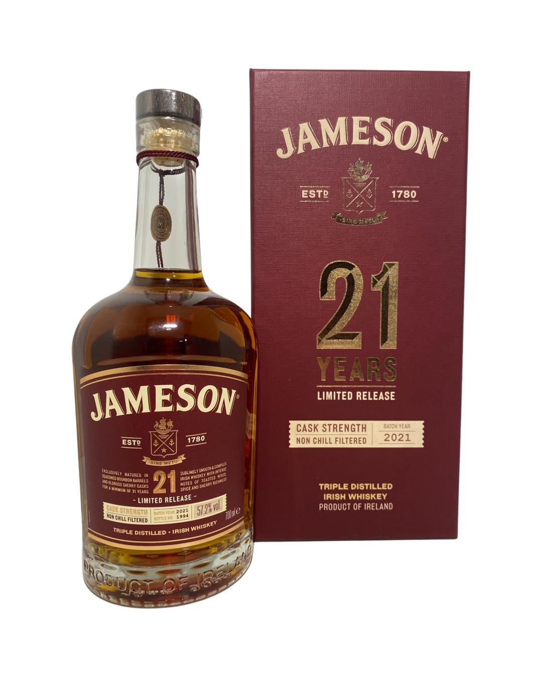 Jameson 21 year old released in 2021 was initially matured in ex-bourbon and oloroso sherry seasoned casks at the Midleton Distillery for 18 years before being blended and re-casked into ex-bourbon barrels for an additional three years. These casks were then married with additional pot still whiskeys that had fully matured for over 21 years in first fill oloroso sherry casks and bottled at cask strength.