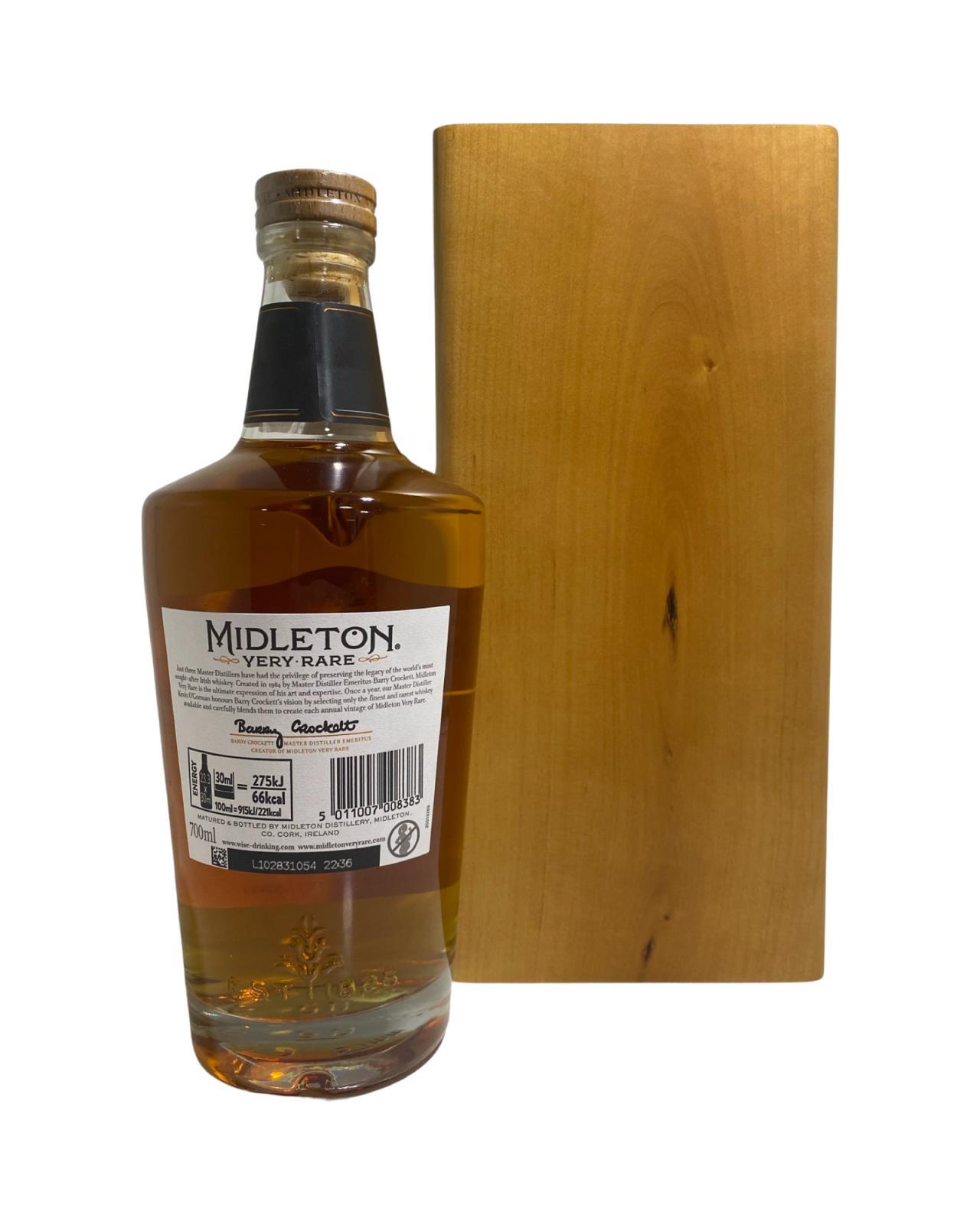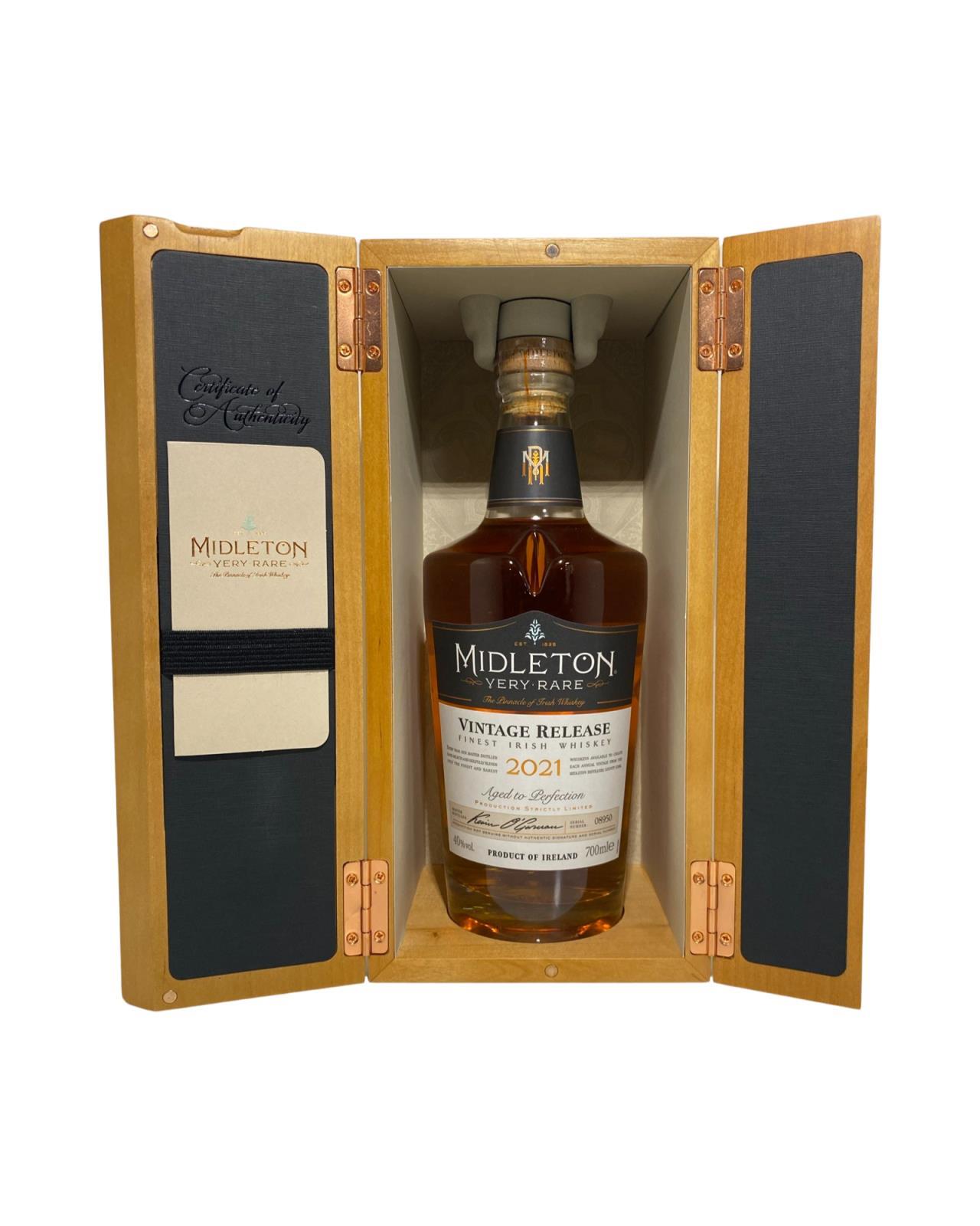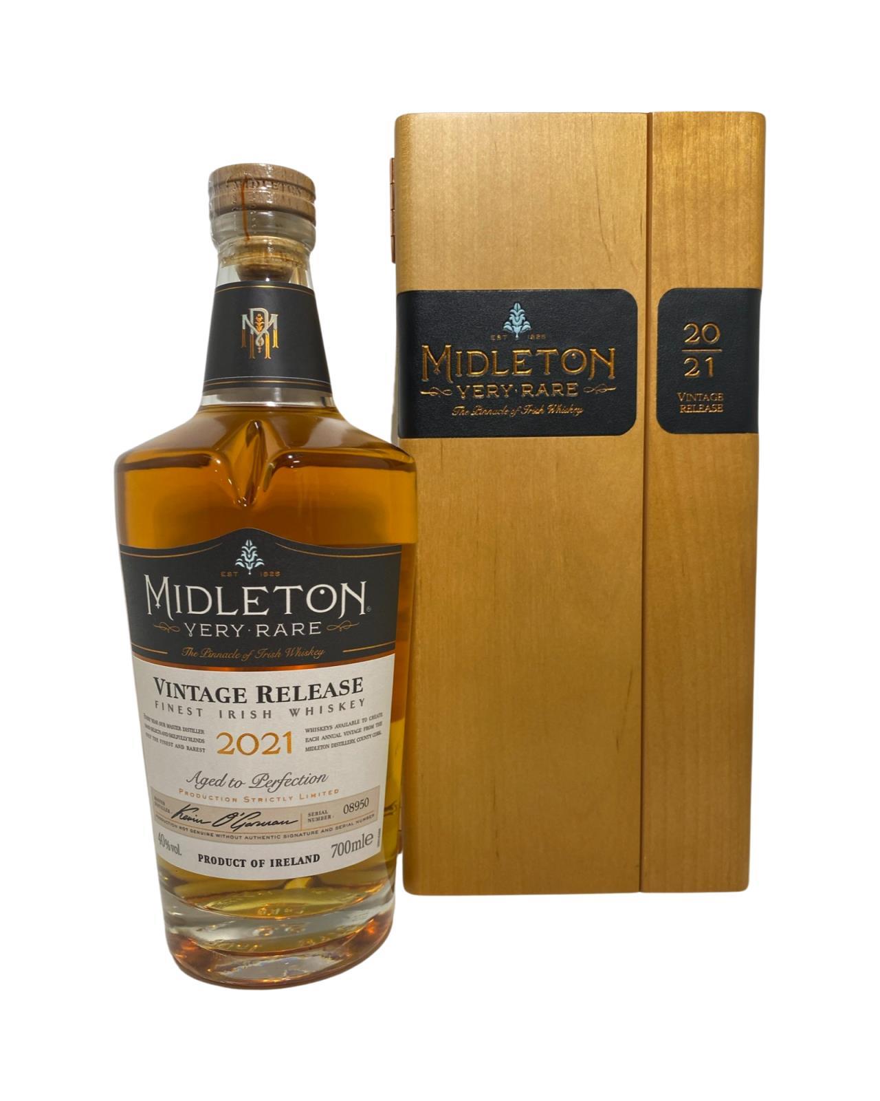 The 2021 edition to Ireland's most premium and beloved whiskey series; Midleton Very Rare. This is the 38th installment and the first release under Kevin O' Gorman appointed Master Distiller of the Midleton Distillery in 2020. Both the bottle and gift box are in very good condition, certificate and distillery invite are also included.  The Midleton Very Rare range of whiskeys is a collection of highly regarded Irish whiskeys crafted at the Midleton Distillery in County Cork, Ireland. With a reputation for excellence, these whiskeys are known for their exceptional quality, craftsmanship, and limited availability. Characterized by smoothness, complexity, and depth of flavour, Midleton Very Rare often exhibits notes of ripe fruits, honey, vanilla, spices, and oak. The component casks are typically aged for around 12-27 years but each yearly batch is unique and for this reason the whiskeys are highly collectible. To this day the Midleton Very Rare series is still regarded as the pinnacle and benchmark for ultra-premium blended Irish whiskeys.
