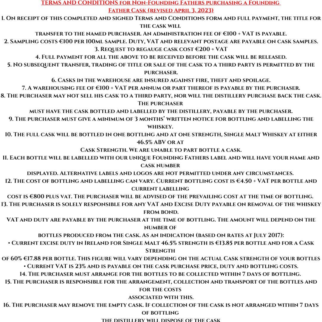 A rare opportunity to own a cask of 10 Year-Old Dingle Single Malt! 2014 (Distilled January 2014) Dingle Distillery Single Malt. It has been fully matured in a Port cask. Bulk litres as of the 8th of January 2024 202L. All bidders must read & agree to the terms & conditions from Dingle Distillery. This gives the option of remaining part of the Founding Father programme (with revised terms) or removing the cask from Dingle Distillery and moving (at your expense) to an alternative bonded warehouse. However, please read carefully so you can see associated charges with each option. We have a small sample of this cask so that potential buyers can purchase a sample for €10 (plus shipping if required). All money collected from samples will be donated to Debra Ireland. Samples can purchased/ordered by emailing Jack@celticwhiskeyauction.com or instore at Celtic Whiskey Shop, 27-28 Dawson Street, Dublin 2. Tasting notes from Dingle. Nose: Dried fruits and raisins. Taste: Toasted coconut, red berry fruits, and a little spice on the finish. Why buy a cask – Buyers of casks are usually from 2 groups of people. Either buying for fun as an individual or as part of a group looking to follow the journey of the cask and then to decide on how long to mature or to change the maturation cask down the line. Or buying as an investment. The value of whiskey casks is related ultimately to supply & demand. Some companies are currently advertising that huge profits can be made but at Celtic Whiskey we'd like to reduce down these expectations. We would like to point out that the value can go up or down so like all investments you should take expert advice if you are buying for that reason. Just because a bottle sells on a retail shelf for say €100, that doesn't give it that value necessarily to a cask owner. The €100 includes 23% vat, a retailers margin, possibly a wholesalers margin, cost of bottling & dry goods, distribution cost, etc. Also, customers have to want to buy your particular product which is the reason similar aged whiskeys can have widely differing sales prices. If looking to sell on bottles of whiskey, please be aware you would need a wholesalers licence if not in the trade.