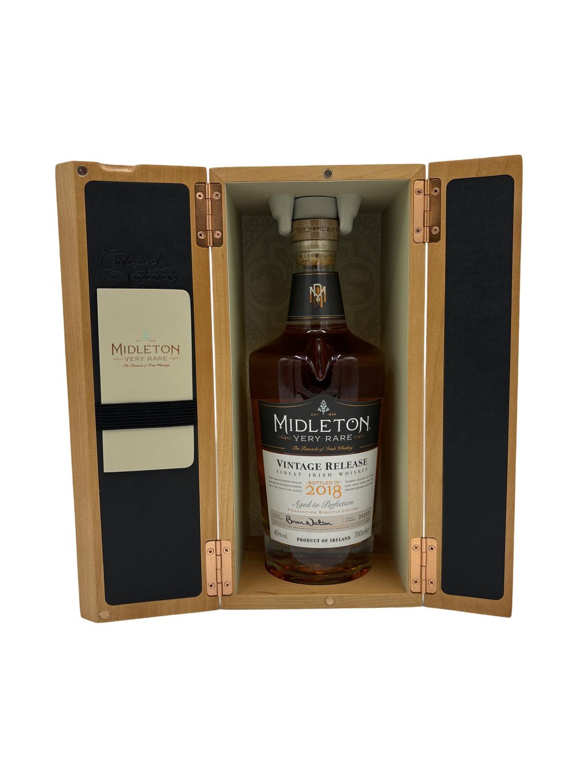 The Midleton Very Rare 2018, is a bottling brought out by the Midleton Distillery in Co. Cork. The ‘Midleton Very Rare’ range was launched in 1984 and a new vintage has been released every year since then. Barry Crockett started off the ‘Midleton Very Rare’ range while he was the Master Distiller of Midleton Distillery, in 2013 Barry Crockett retired from his role of Master Distiller. From 2014 onwards Brian Nation has been creating the ‘Midleton Very Rare’ range, maintaining its role as standard-bearer and pinnacle of Irish Whiskey. The bottle and gift box in great condition also include the cert and distillery invite. Old bottle style and label.The Midleton Very Rare range of whiskeys is a collection of highly regarded Irish whiskeys crafted at the Midleton Distillery in County Cork, Ireland. With a reputation for excellence, these whiskeys are known for their exceptional quality, craftsmanship, and limited availability. Characterized by smoothness, complexity, and depth of flavour, Midleton Very Rare often exhibits notes of ripe fruits, honey, vanilla, spices, and oak. The component casks are typically aged for around 12-27 years but each yearly batch is unique and for this reason the whiskeys are highly collectible. To this day the Midleton Very Rare series is still regarded as the pinnacle and benchmark for ultra-premium blended Irish whiskeys.